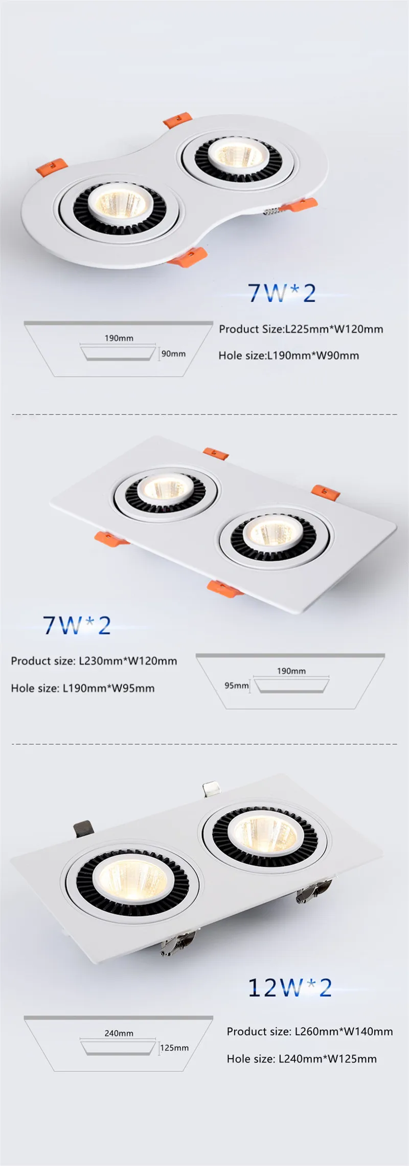 Параметры продукта Вход Напряжение: AC85-265V с регулируемой яркостью 110V 220V 50/60Hz Мощность: 14 Вт (2*7 Вт)/24 Вт (2*12 Вт) Индекс цветопередачи (CRI):>Ra90 Светодиодный чип: C0B чип (CREE) Световой поток: 95 ~ 110 лм/Вт Температура: от-25 до 45 ° Уровень защиты: IP52 Цветовая температура: теплый белый:(3000K); Чистый белый:(4000K); Холодный белый:(6000K) Срок службы: 50000 ~ 80000 часов Одобрено: CE/RoHS/FCC/CCC Гарантия: 2 года 1. Уникальный дизайн-регулируемый диапазон 360 ° может обеспечить большое удобство в повседневном использовании. Просто поверните, чтобы осветить область! 2. Высокое качество-изготовлен из литого под давлением алюминиевого сплава, с новым дизайном радиатора, чтобы продлить срок службы. Светодиодный светильник COB 3 Вт и стеклянные линзы с высоким коэффициентом пропускания, ярче и стабильнее, чем стандартный светодиодный чип. 3.DIMMABLE & CRI-светодиодный светильник имеет возможность плавного затемнения с помощью современных светодиодный диммеров. CRI90 +, обеспечивает светильник, близкий к солнцу, качественный светильник для реального цветопередачи и консистенции внутри вашего дома, более яркий естественный цвет. 4. Простая установка-встроенные светодиодные светильники могут быть легко. Светодиодный драйвер затемнения включен. Дополнительные встроенные банки и аксессуары не требуются. См. Изображение процесса установки. 5. Широкое применение-угол поворота 360 градусов, супер яркое освещение, идеально подходит для конференц-залов, магазинов, супермаркетов, офисов, магазинов, выставок, танцевальных залов, баров, кухонь, жилых комнат, использование в спальне и более коммерческое или жилое применение. Посылка 1 шт. светодиодный светильник 1 шт. светодиодный драйвер