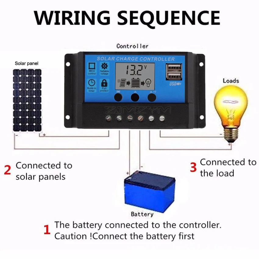 1. Подключите аккумулятор к регулятору заряда-плюс и минус.