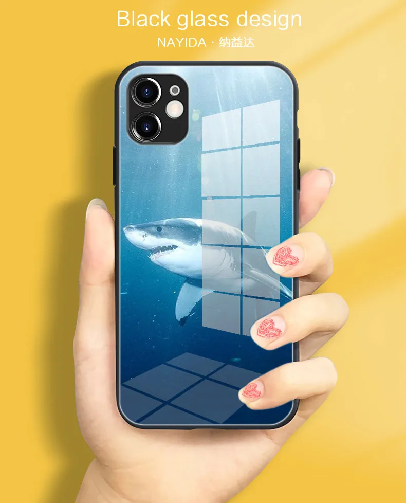 shark open mouth drawing Glass Silicone Case For iPhone 12 11 Pro X XS Max XR 8 7 6 Plus SE 2020 S Mini Balck Soft Cover