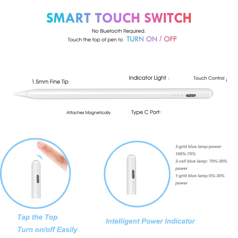 СпецификацияМодель зарядки: Тип CМатериал наконечника: помпонМатериал корпуса: алюминиевый сплавДлина корпуса: 164 ммРежим связи: дважды нажмите на сенсорный выключательПодходящая модель: версия IOS 2018 или вышеПосылка включает:Стилус для ipad * 1Сменный наконечник * 1USB кабель * 1