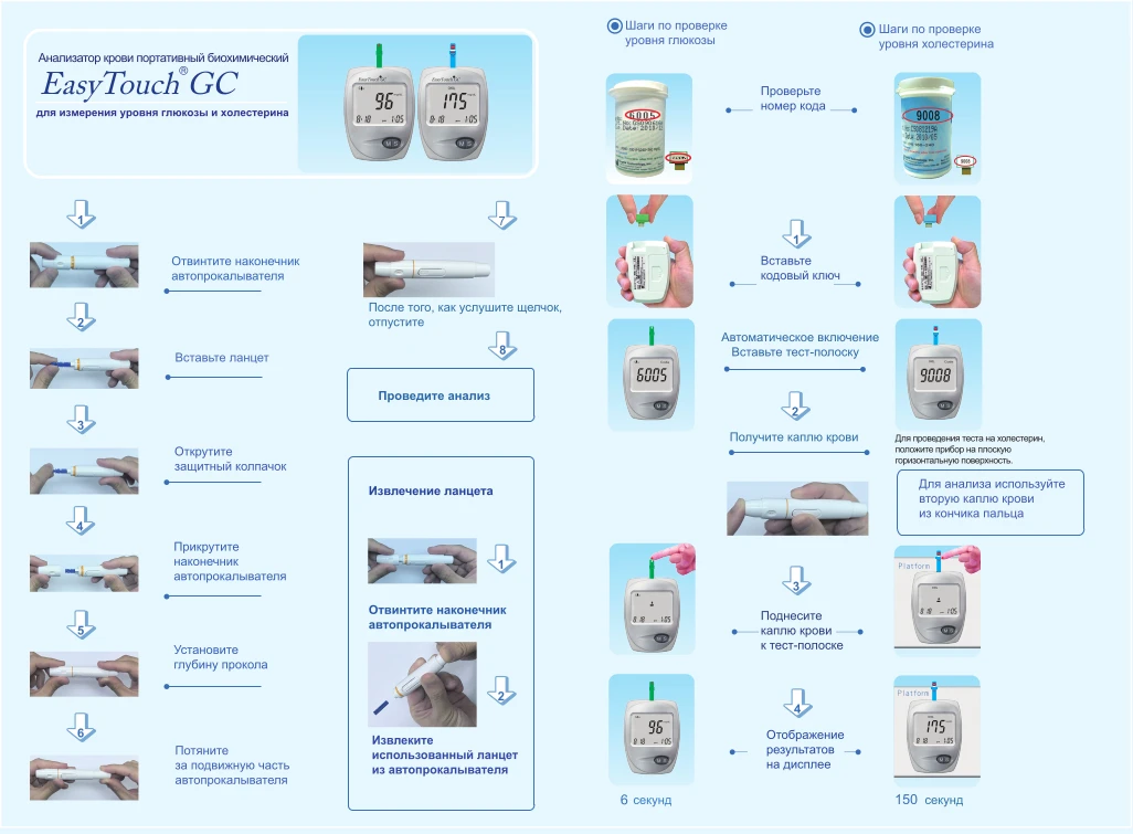 Прибор обладает функцией сохранения данных, что поможет Вам наблюдать за ходом изменений уровня глюкозы и холестерина в крови.
