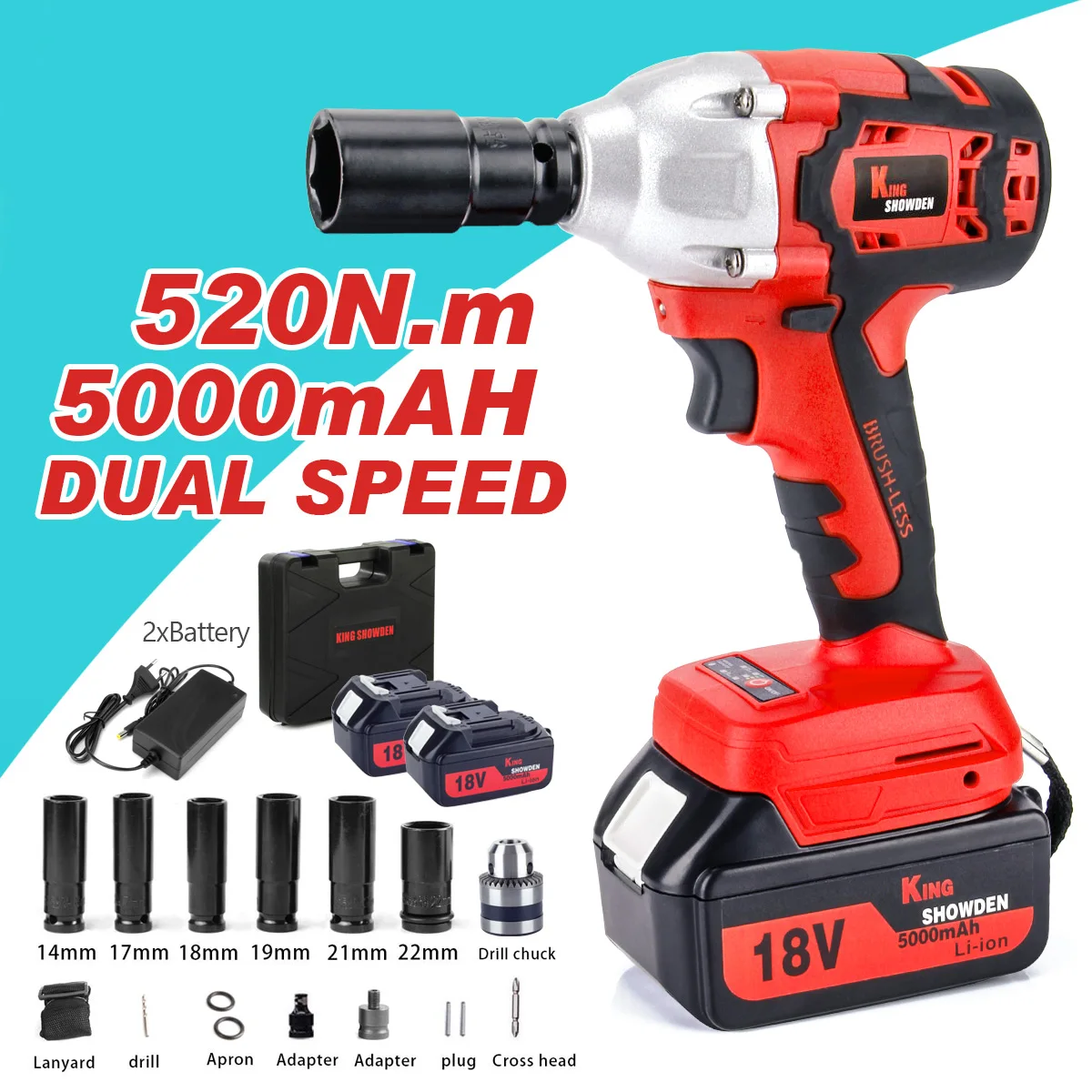 【Полный аксессуар 】комплект поставляется с ударным гаечным ключом, 2*18V 5Ah литиевая батарея, пара перчаток, 1 * Адаптер зарядного устройства, 6 гнезд удара (14, 17, 18, 19, 21, 22 мм), 1 * сверлильный патрон, 1 * ремешок, 2 * фартук, 2 * адаптер, 2 * вилка, 1 * поперечная головка, 1 * Руководство пользователя, 1 * ящик для инструментов.