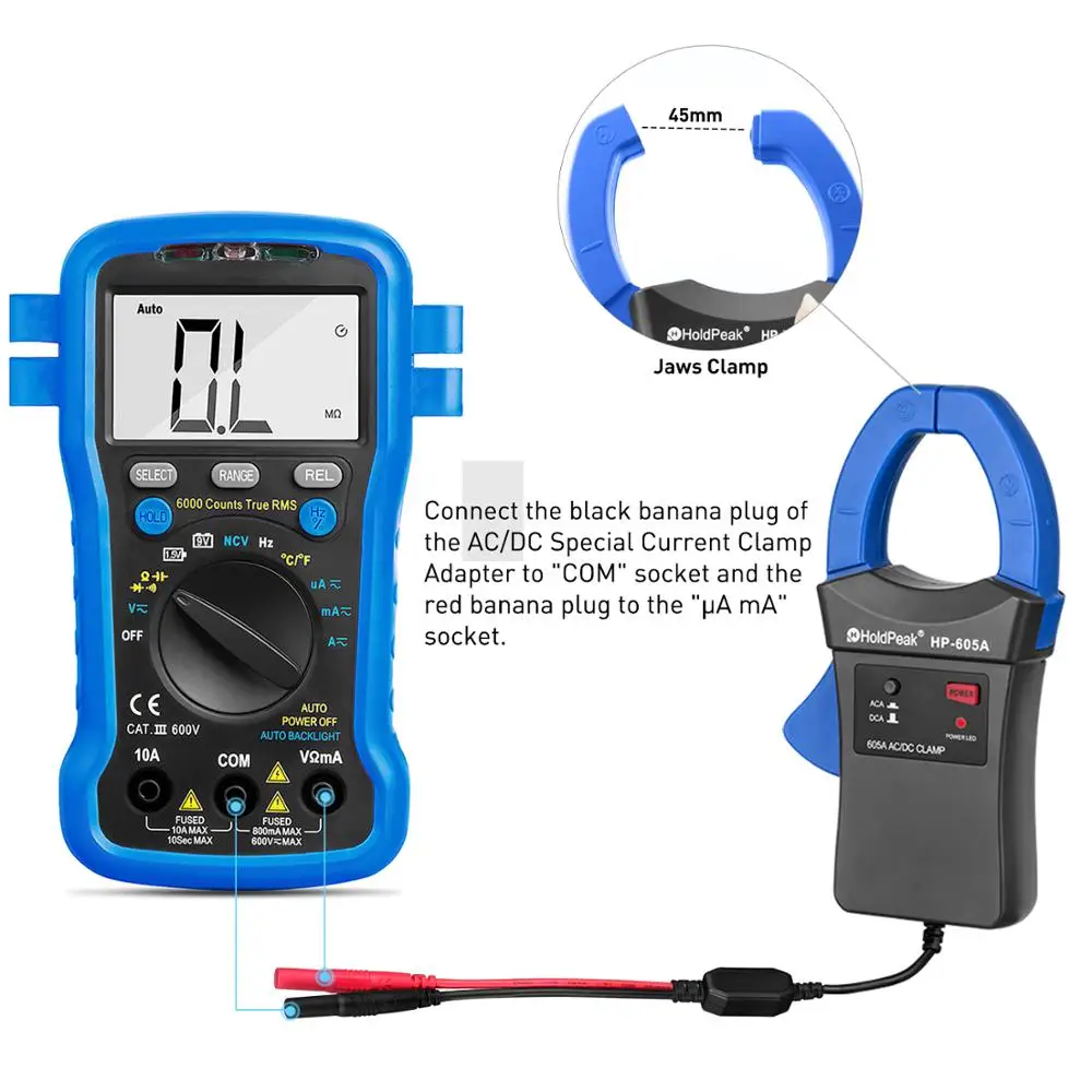 Наименование товара:HoldPeak HP-605A Зажим адаптер 600A AC/DC сила тока светодиодный 45 мм Калибр челюсти