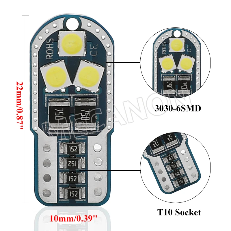 10 шт. T10 W5W 3030 6SMD светодиодный 12V