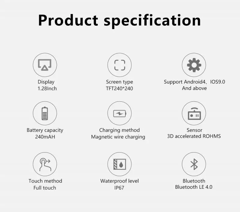 Этот продукт использует новый ультра-низкий Мощный двойной Bluetooth чип, 1,28 Полный Круглый экран, полностью подходящая технология, дисплей экрана высокой четкости, чрезвычайно гладкая, 240 мАч Высокая емкость чистая кобальтовая батарея, срок службы батареи дольше и прочнее, металлический корпус из цинкового сплава, с вакуумным покрытием, текстура более прочная и деликатная.