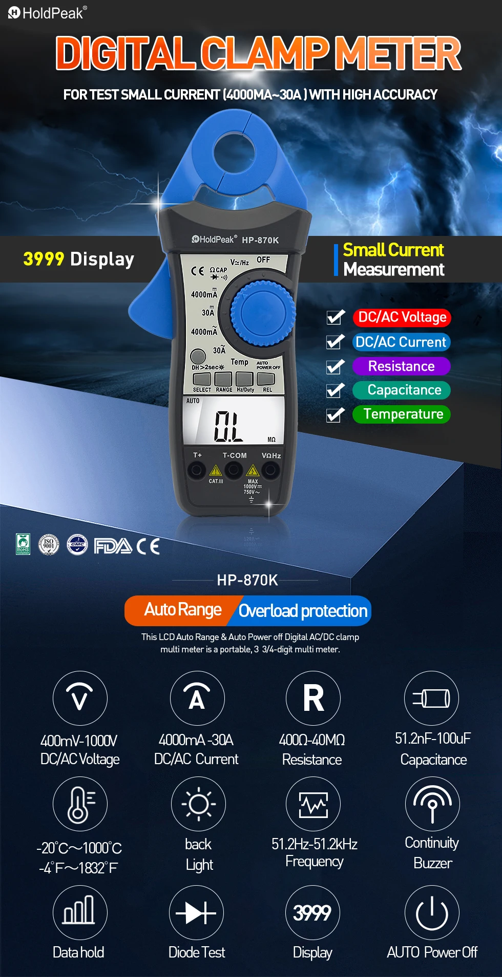 Цифровой мультиметр HoldPeak, HP-870K дюймов, Автоматический диапазон, постоянный ток, переменный ток