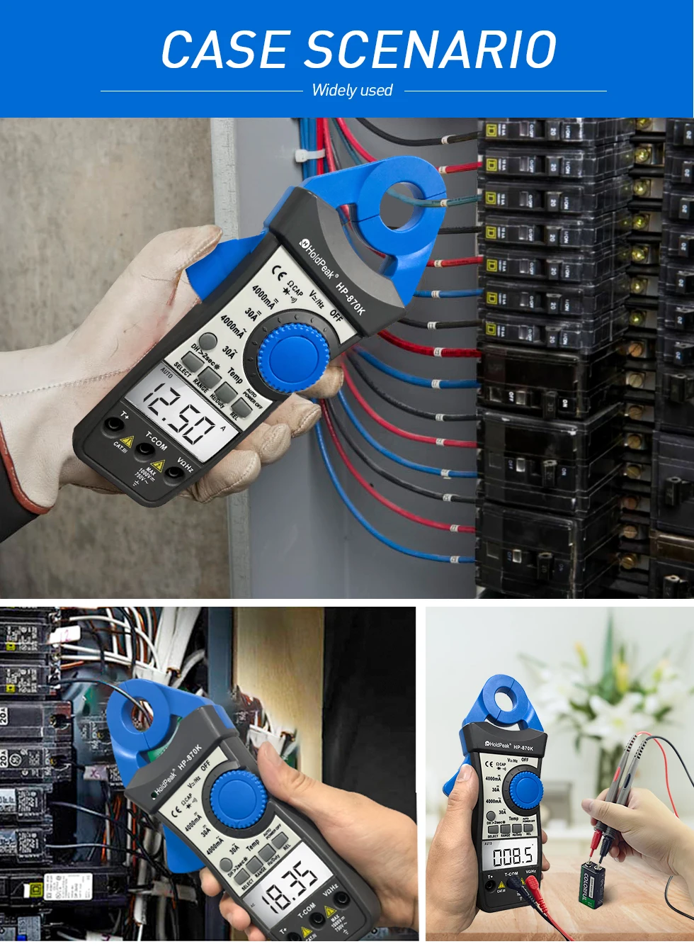 HP-870K зажимных измерительных клещей можно набирать через переключатель, изменяя различные диапазоны. Прибор может использоваться для измерения напряжения переменного и постоянного тока, тока, емкости, диода, сопротивления, температуры, частоты и т. д.