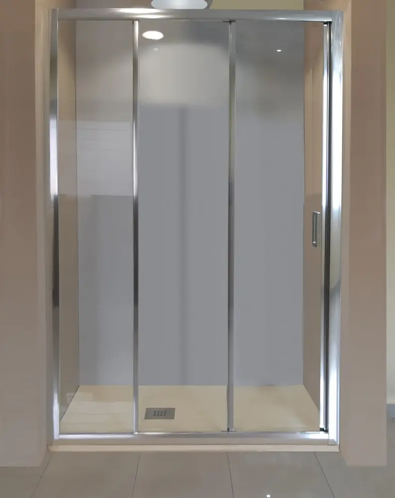 Передний душевой экран, состоящий из фиксированного с двумя раздвижными дверями, прозрачное стекло 6 мм, профиль по всей своей конструкции и высота 195 см. Полированный анонизированный алюминий профилирования с блестящей серебряной отделкой.