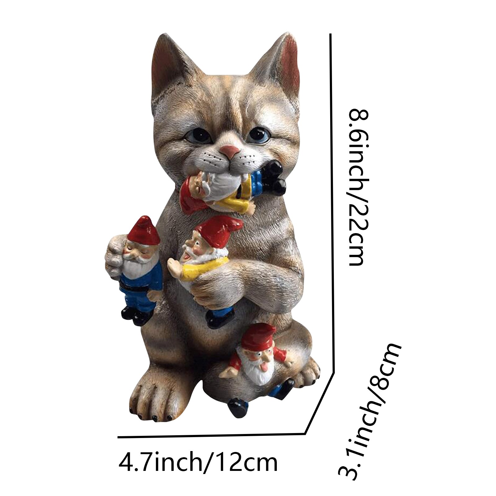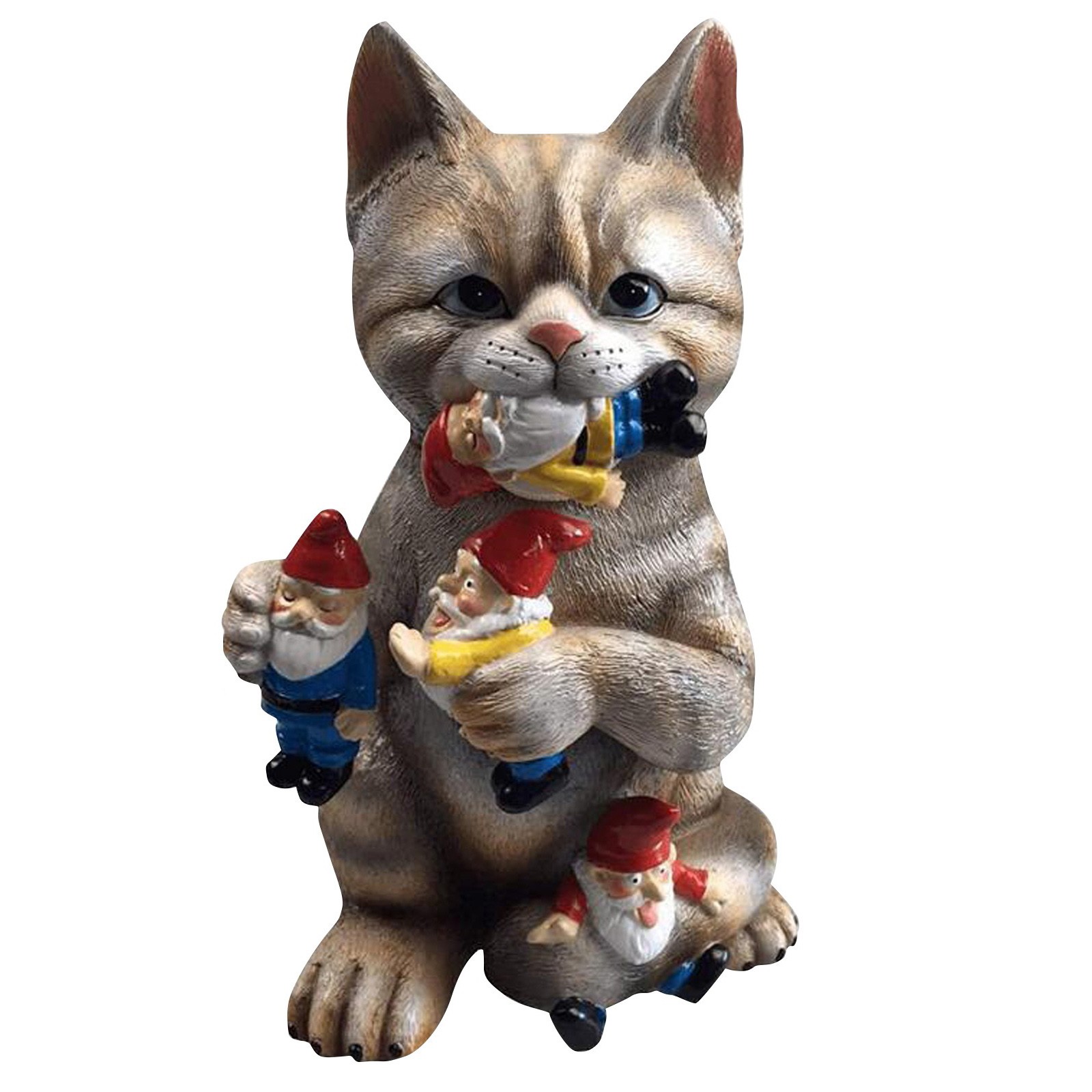 NO MORE BORING GARDEN DECOR - this beautifully hand painted resin cat with tiger stripes and cuteness overload is sure to be the centerpiece of your garden this year and a joy for your friends to find hiding in your Annuals and Perennials DON'T WORRY - only eats gnomes. Dogs, mailmen and neighbors are 100% safe. Perfect gifts for gnome lovers or haters, Moms, Dads, Daughters, grandparents. Wonderful housewarming gift. HIGH QUALITY - handcrafted and made from durable resin material. Big enough to be noticed but small enough to fit on a bookshelf. Perfect size for many locations. Guaranteed to make the number of gnomes in your garden greatly decrease.Product List: