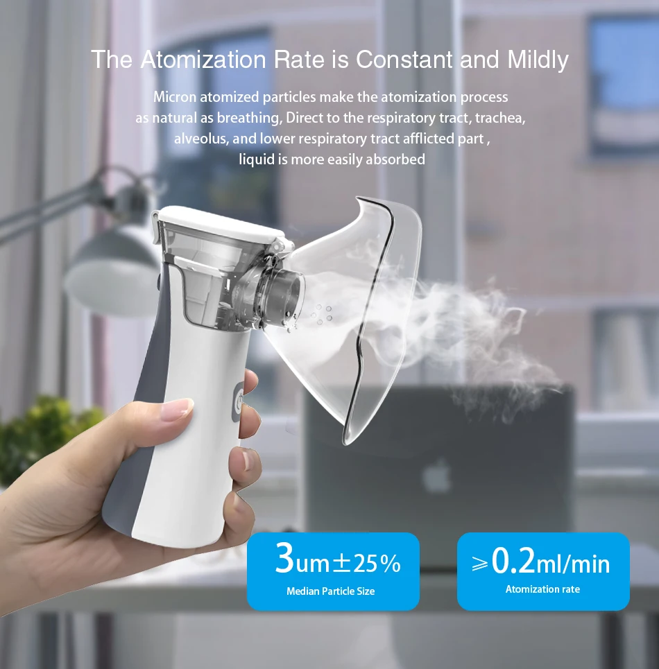 Он в основном используется для лечения различных заболеваний верхних и нижних дыхательных систем, таких как простуда, жар, кашель, астма, боль в горле, фарингит, ринит, бронхит, пневмокониоз и другие трахеи, бронхи, альвеоли и болезни грудной клетки. Небузированная Ингаляционная терапия является важным и эффективным методом лечения респираторных заболеваний. Небузированный ингалятор используется для распыления раствора препарата в крошечные частицы. Препарат поступает в дыхательные пути и легкие через дыхательные ингаляции, тем самым достигая безболезненности в целях быстрого и эффективного лечения, пожалуйста, Управляйте Методом Распыления при медицинской консультации.