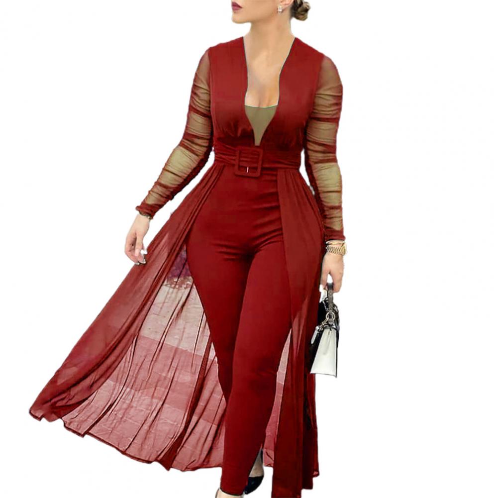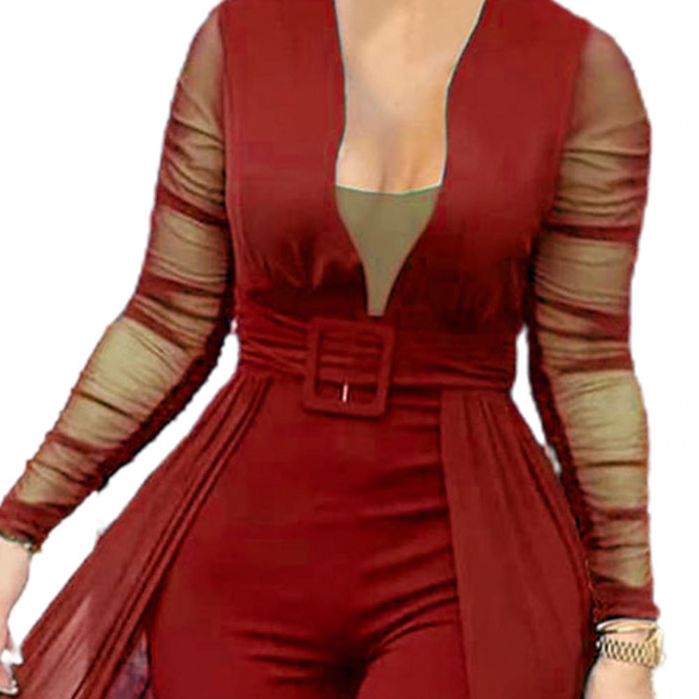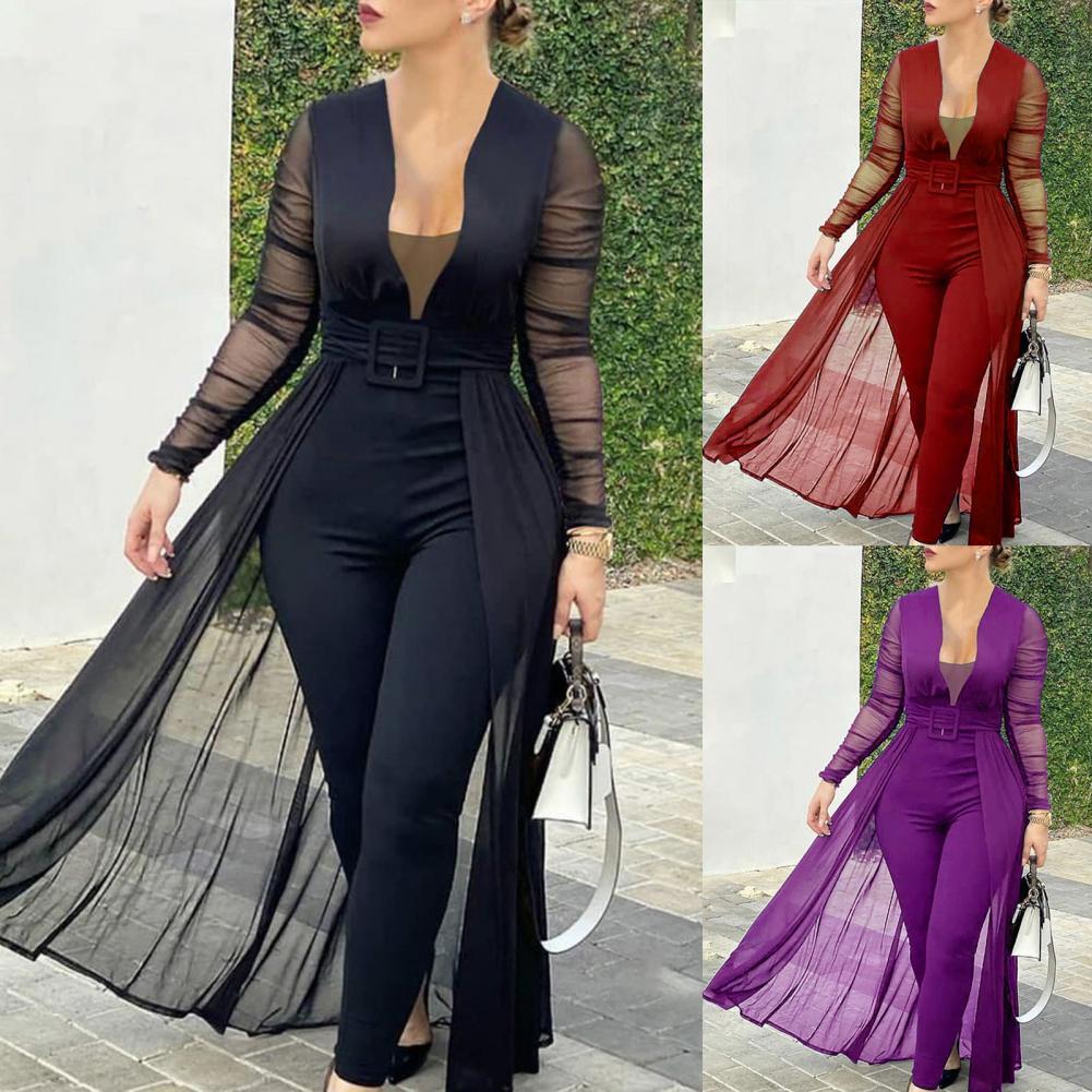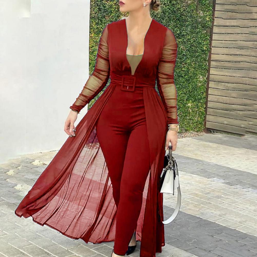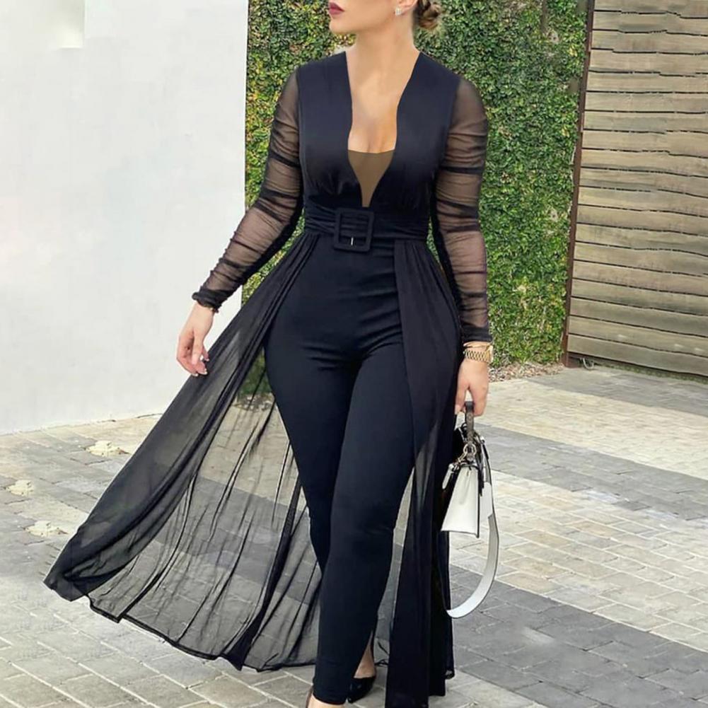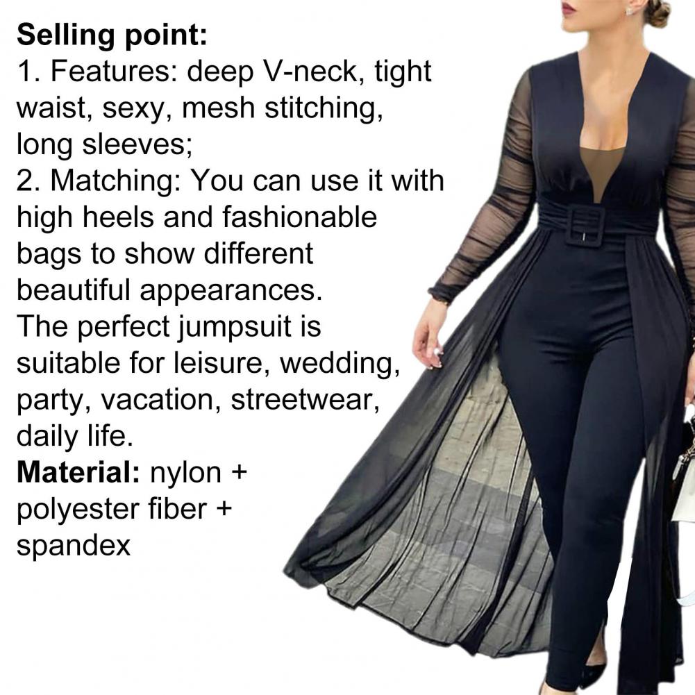 Облегающий фигуру комбинезон хорошо подчеркивает ваше сексуальное тело. Этот комбинезон с прозрачными вставками, глубоким v-образным вырезом, прозрачными рукавами и поясом наполнен модными элементами.