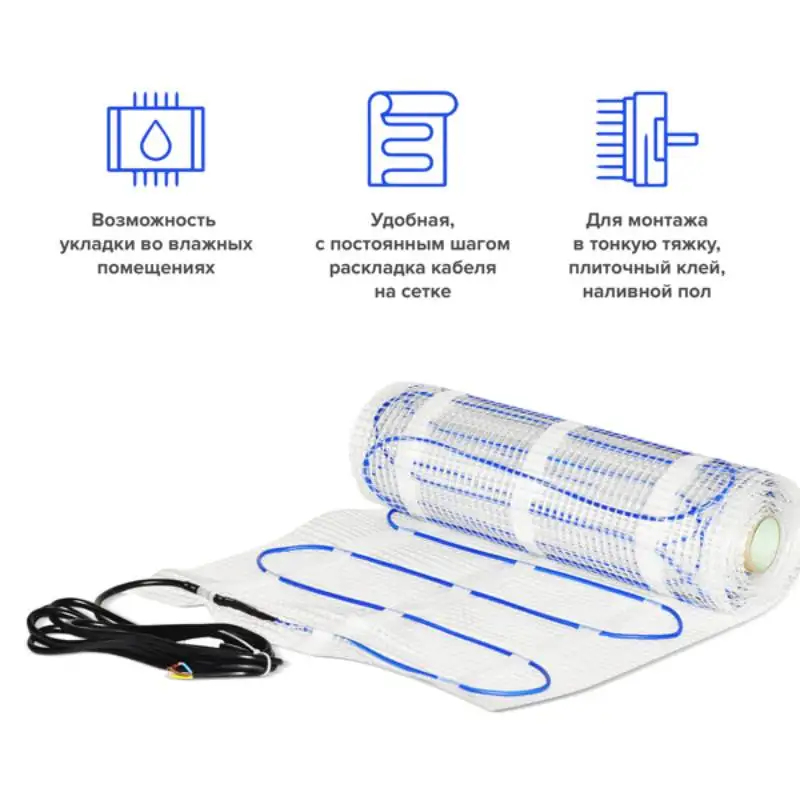 Нагревательный мат UHK-МЭлектрический тёплый пол с двужильным экранированным кабелем, предназначен для монтажа под плитку, в тонкую стяжку или наливной пол. Раскладка с постоянным шагом кабеля на сетке позволяет осуществить легкий и быстрый монтаж термомата на любых поверхностях даже сложных конфигураций.