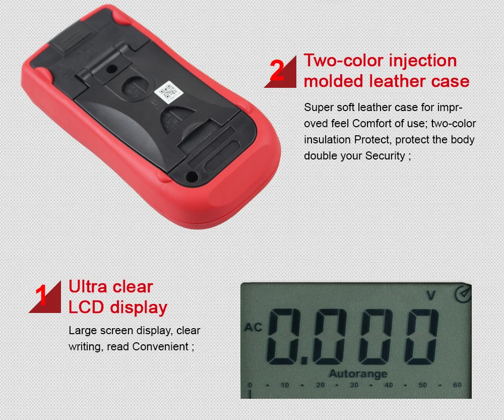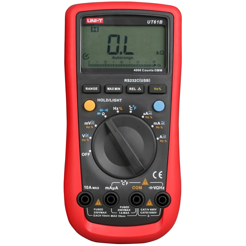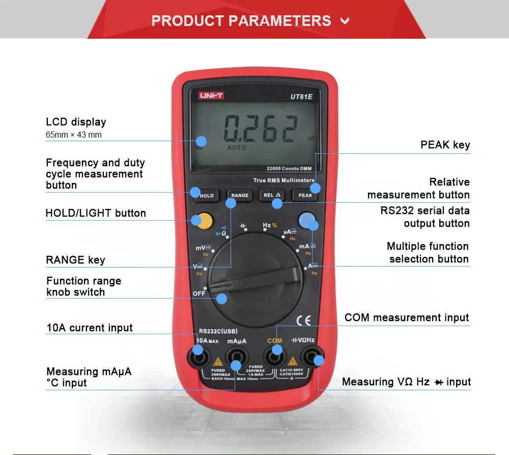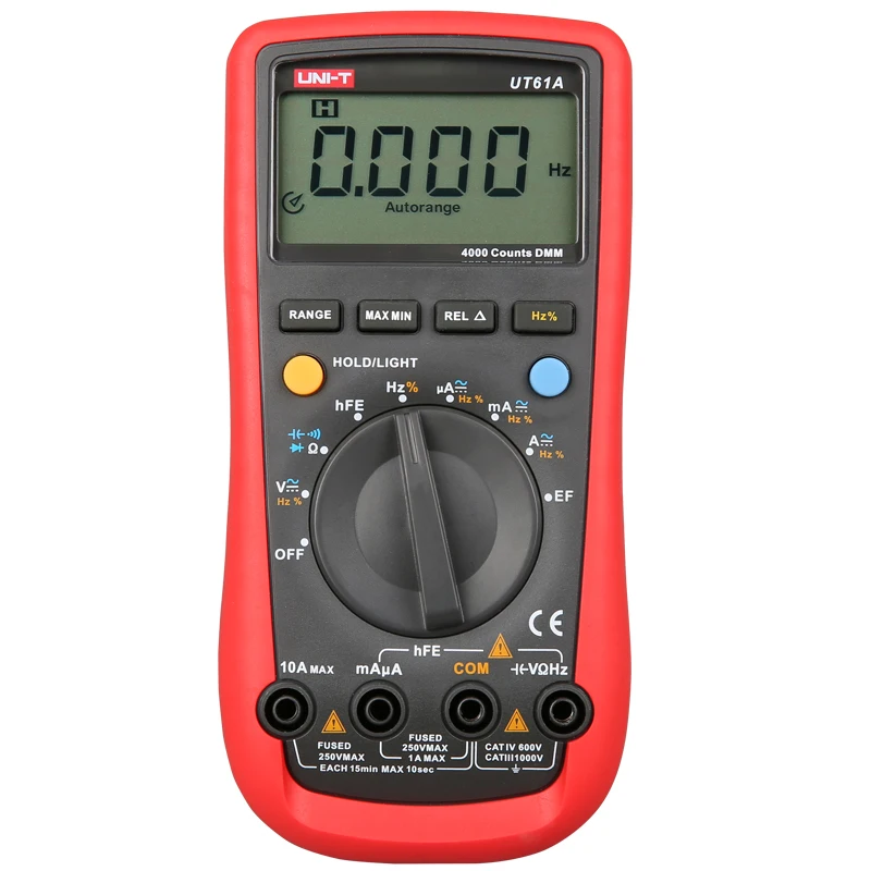 Цифровой мультиметр модели UT61A, UT61B, UT61C, UT61D (True RMS) и UT61E (True RMS)-это автоматический мультиметр. Конструкция корпуса принимает передовую технологию «co-инъекции», чтобы обеспечить достаточную изоляцию. Измеритель может измерять напряжение переменного/постоянного тока и сопротивление току, диод, непрерывный зуммер, емкость, частоту, температуру (C или F), функцию hFE и EF