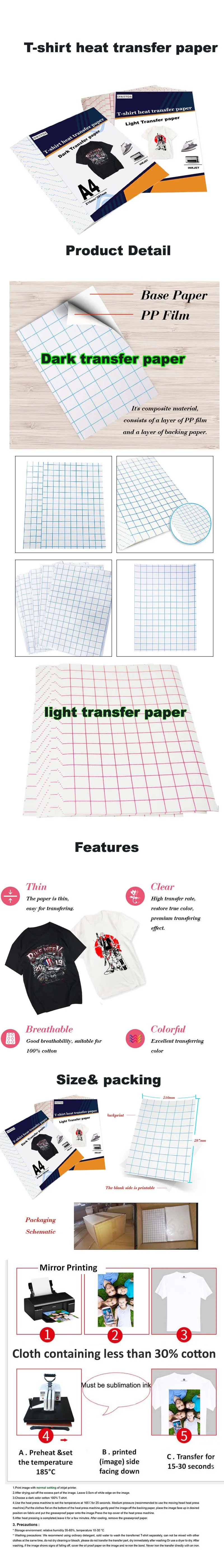 (2) Бумага для передачи тепла темного цвета-это своего рода струйный для передачи бумаги для хлопкового текстиля темного цвета. Предлагаем использовать любые цветные струйные принтеры для печати, обычные чернила на водной основе (например: Пигментные чернила или красящие чернила) можно использовать для печати изображений. Таким образом, вы можете создать свою собственную индивидуальную футболку, рубашку, халаты, спортивную одежду, шляпы, сумки, подушки, подушки для мыши, носовые платки, маски, украшения для дома и т. д.
