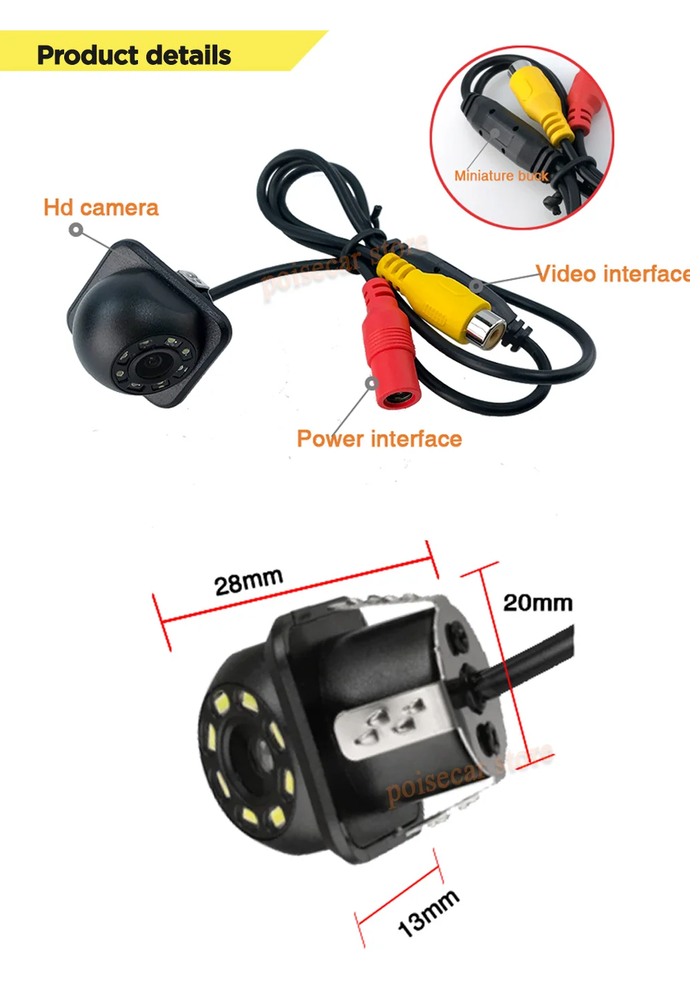 Особенности: 1. Интеллектуальная динамическая Направляющая линия транспортного средства, обратная линия, безопасная парковка. 2. Динамический трек, ночное видение, четкое изображение. 3. Сильный анти-помех, водонепроницаемый, ударопрочный. Характеристики: -Режим сигнала: CVBS -Датчик изображения: CCD -Формат видео: NTSC -Пиксель: 720x480 -Разрешение: 520 ТВ-линия -Угол: 140-170 градусов -Рабочее напряжение: 12 В постоянного тока -Уровень водонепроницаемости: IP68 -Рабочая температура (Deg.C): -30 ~ + 80 -Длина кабеля питания: 1 м -Длина видеокабеля: 6 м