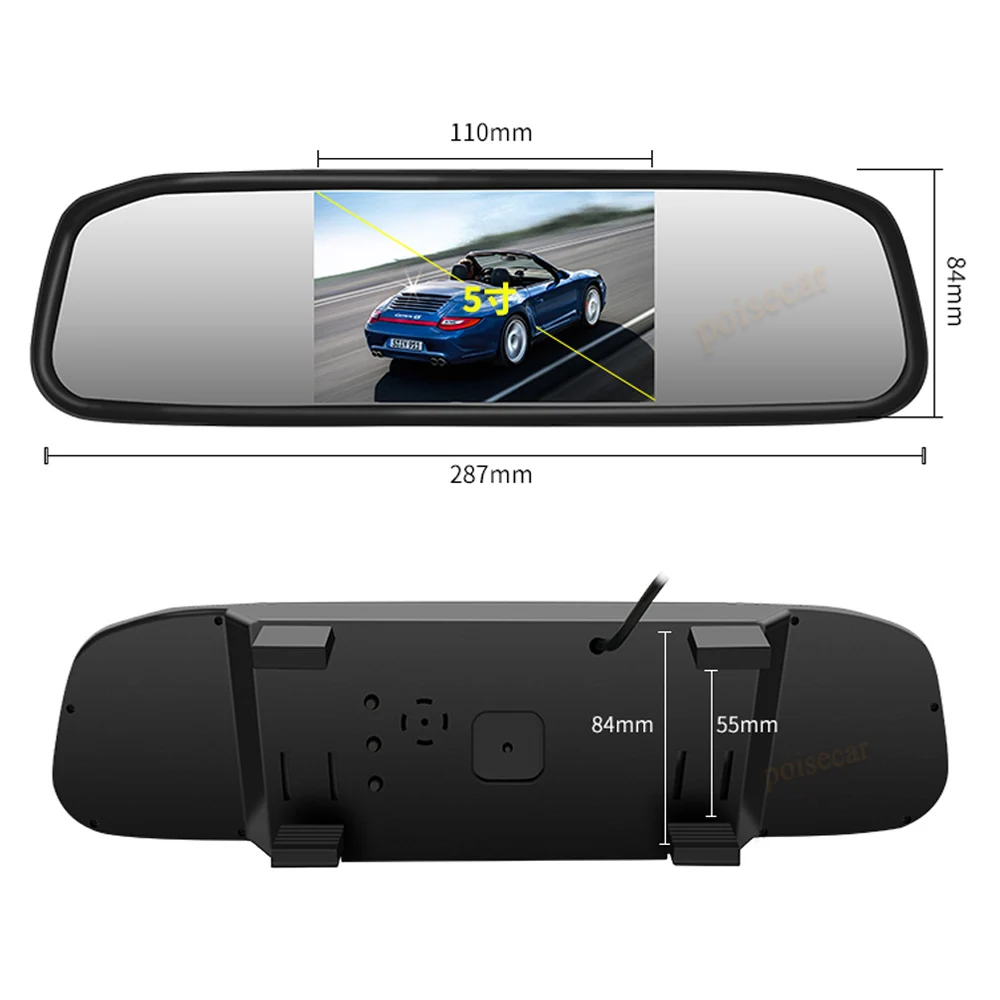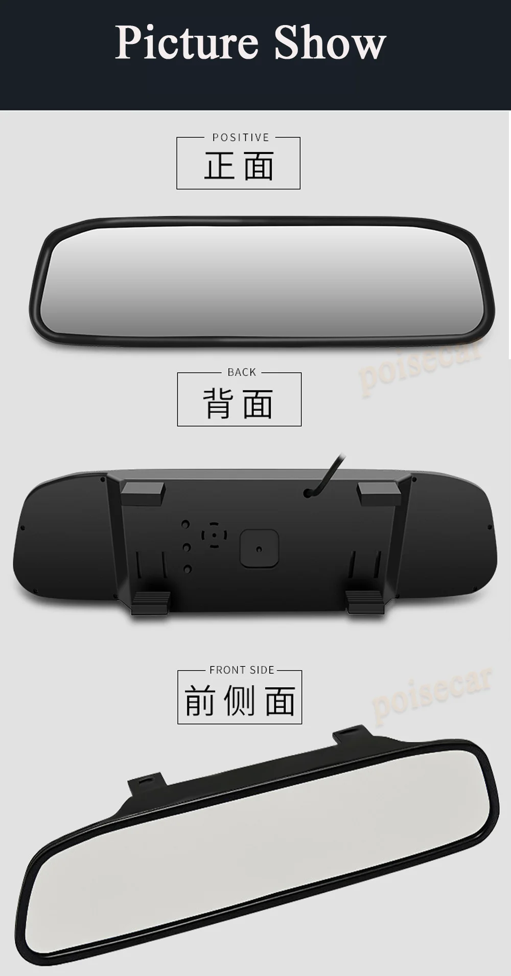 Характеристики монитора: 5 дюймов цвет TFT ЖК-дисплей монитора. С 2-полосная аудио-видео входа: А. AV1 (желтый) отображается по умолчанию, он может быть подключен к автомобильному DVD, видеомагнитофону и другому видео оборудованию; AV2 (белый) подключен к камере заднего вида транспортного средства. B. При реверсе монитор автоматически переключается на изображение заднего вида. . Нет аудиовхода или выхода. . Экран черного цвета, когда нет видео сигнала. . Складная конструкция для удобного места. Характеристики монитора: Режим сигнала: аналоговый сигнал Экран Размер: 4,3 дюймов Соотношение сторон экрана: 16:9 Разрешение: 800x480 Формат видео: NTSC, PAL Рабочее напряжение: 9-32 В постоянного тока Рабочая температура (Deg.C): -40 - + 80 Размеры: 287x84мм