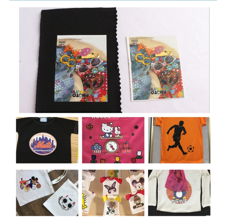 Main specifications: A4 (210mm X 297mm)-100 sheets/pack, A3 (297mm X 420mm)-100 sheets/pack 1. General description and usage The dark laser heat transfer paper can print images freely, and transfer them to various colors of pure cotton T-shirts, bags, mouse pads and other decorations through an electric iron. 2. Advantages ■ Suitable for multi-variety, small batch production. ■ The process is simple, no need to make a plate directly to print out, the process is short, save time and effort. ■Can be DIY, transfer your favorite pictures and images to cotton, polyester cotton and other textiles. ■Can print and hot T-shirts, cultural shirts, hats, sportswear, sweaters, bags, mouse pads, etc. It can be operated with a household electric iron or heat press machine. ■Have color retention and repeated washing. 3. Model used Color laser printer 4. The process of heat transfer machine transfer a. Use the heat press machine to set the temperature at 165°C for 25 seconds. Moderate pressure. b.Put the clothes flatly on the bottom plate of the heat press, and iron them for 5 seconds. c.After the thermal transfer paper is printed, let it cool down, cut it off, and tear off the film. d. Put the film on the clothes gently, with the printing side facing up. e.Greaseproof paper covers the transfer film. f. Cover with a layer of cotton cloth. g. At 165°C, heat press machine for 25 seconds. h. Remove the greaseproof paper. Finish. 5. Matters needing attention Storage environment of printing paper: relative humidity 35-65%, temperature 10-30°C. Precautions for washing: We recommend washing the transferred T-shirt with ordinary detergent and cold water separately. Do not wash with other clothes at the same time. Do not dry clean or bleach. Please do not rub the transferred part and dry it immediately after washing. Or use a dryer to dry. After washing, if the image shows signs of peeling off, you can cover the image with transfer paper and re-iron and bond it. Do not iron the transfer part directly with an iron.