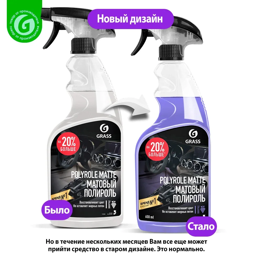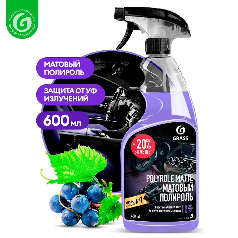 Полироль-очиститель пластика матовый "Polyrole Matte" виноград (флакон 600 мл) Профессиональный матовый полироль Grass «Polyrole Matte» для обработки