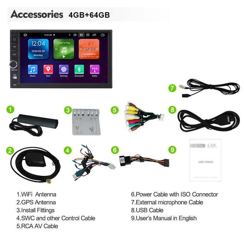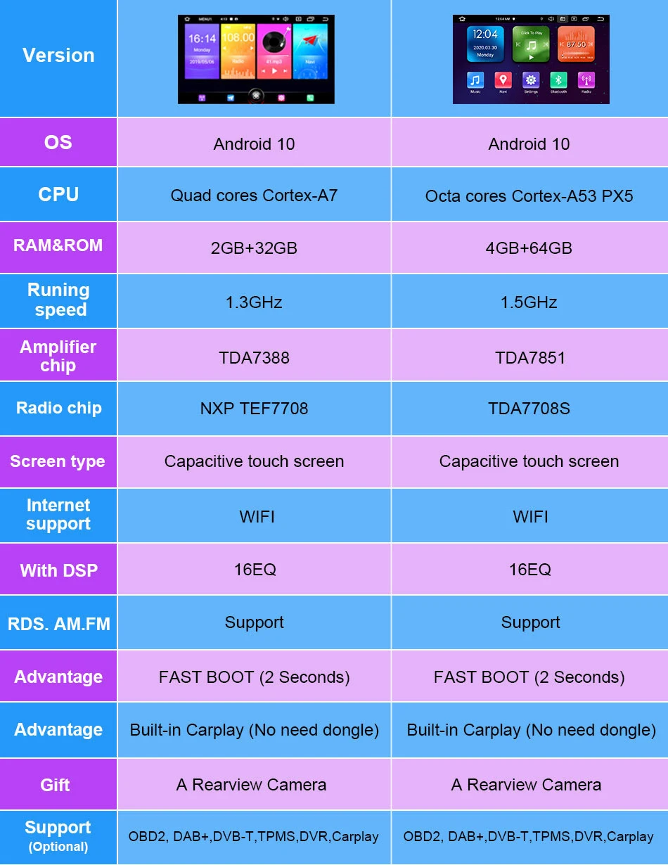 Подарки: 1. Бесплатная карта 2. Ключевые особенности камеры заднего вида: 1. Встроенный Carplay, не требует использования ключа carplay, подключите нашу машину к вашему смартфону напрямую 2. Быстрая загрузка, всего две секунды, машина начнет 3. Функции ОС Android 10: GPS / Bluetooth/Радио/RDS/Встроенный Wi-Fi / Mirror-Link / DSP/Встроенный CarPlay / USB / SWC / AUX вход/игры/8 цветов Кнопка подсветильник видео: аудиовход камеры: AUX1 Видеовыход: video1/video2 аудиовыход: FL/FR/RL/RR/сабвуфер версия BT: 4,0 быстрая загрузка показывает (обычно 2 секунды):