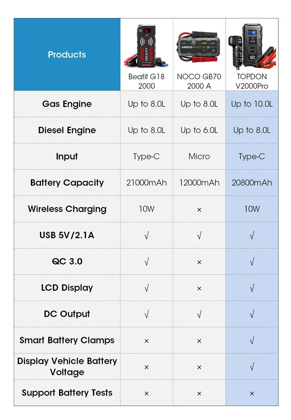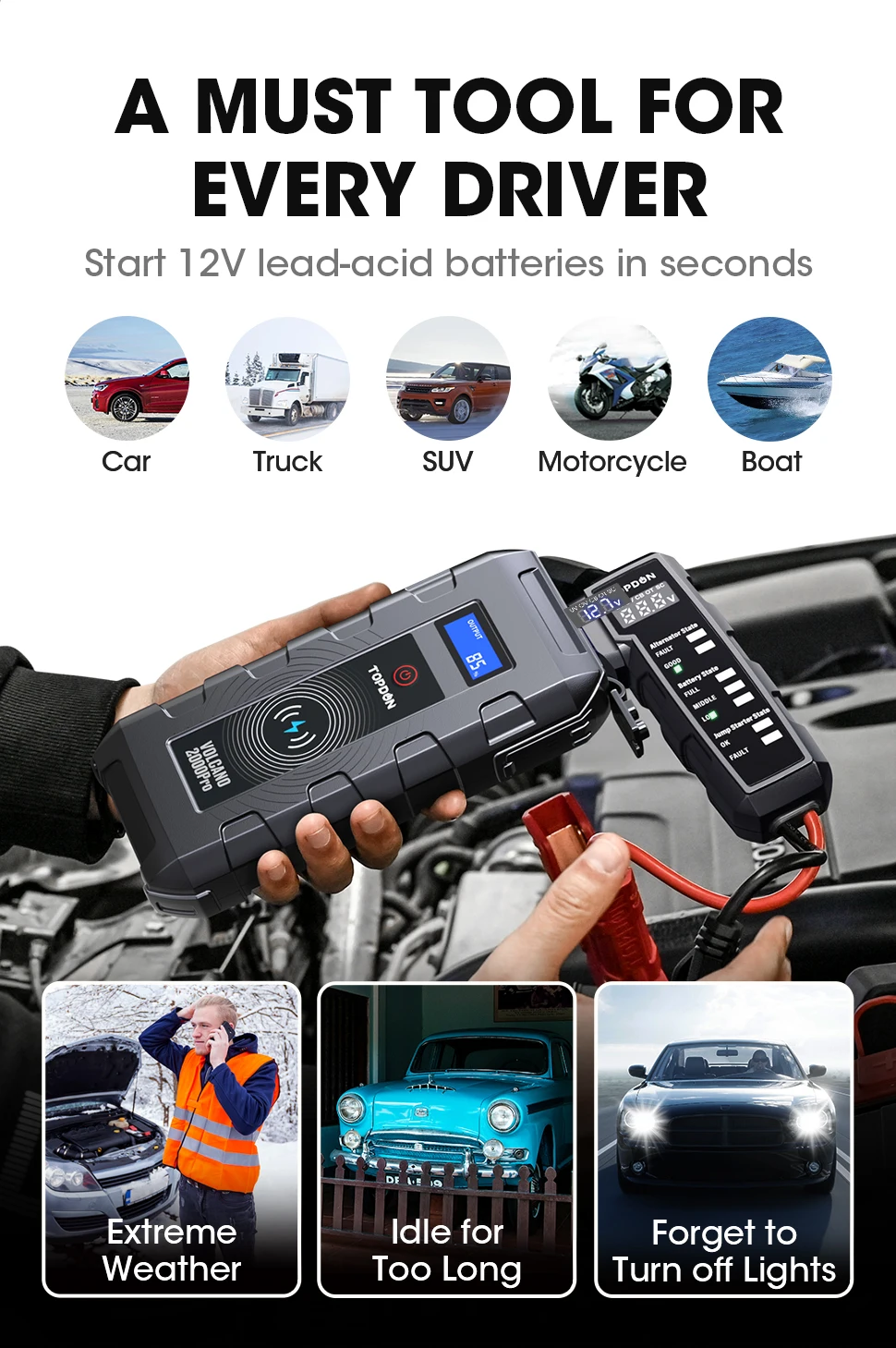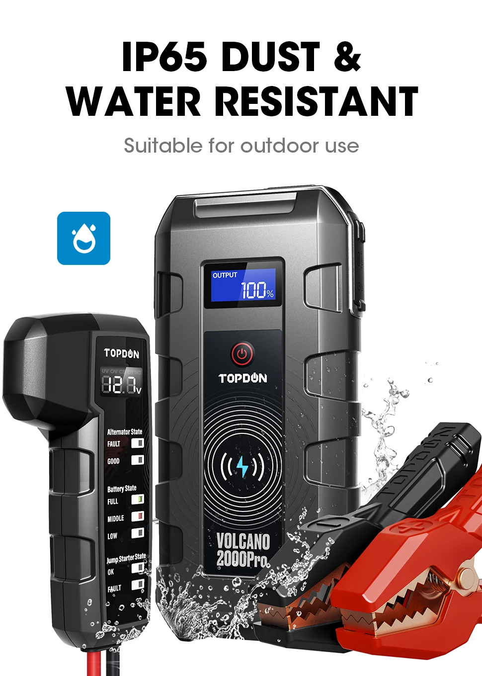 Topdon V2000pro встроен в аккумулятор 20800 мАч. Это работает как портативное зарядное устройство Беспроводное зарядное устройство для мобильный телефон или планшетный ПК, а также она является поддержка с подкладкой Быстрая зарядка. И функция manin-это пусковая установка для автомобильного аккумулятора