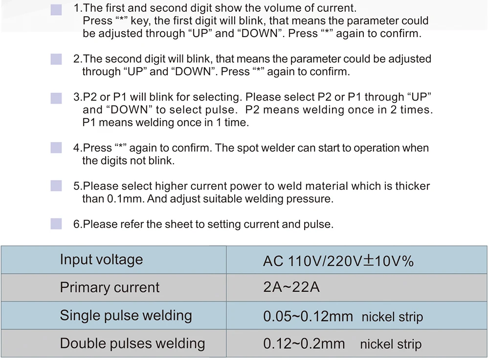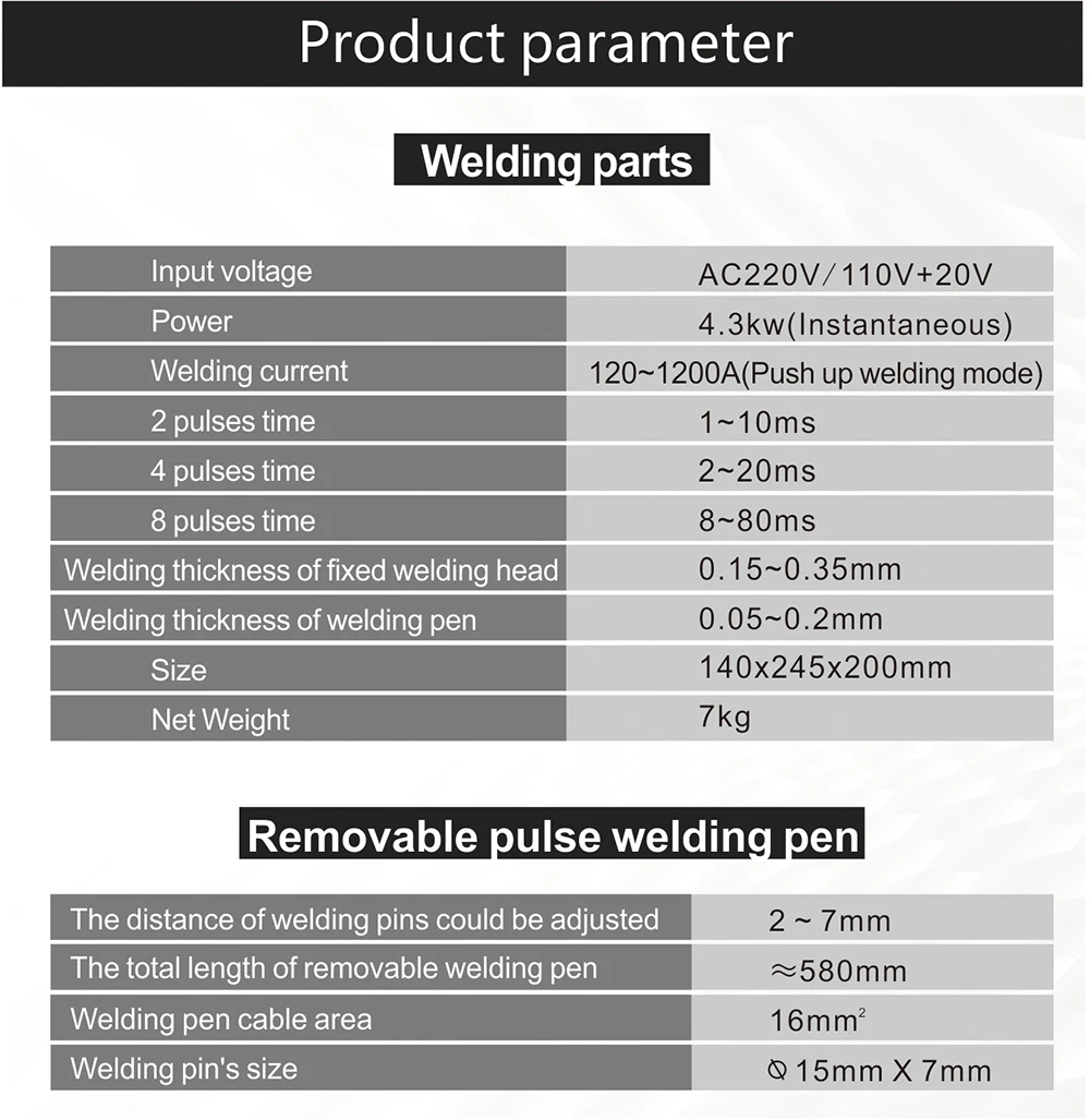 Характеристики: 100% новые и высококачественные. Тип: точечный сварочный аппарат для батареи Модель: SUNKKO 737G + Входное напряжение: 110 В/220 В Мощность: 4,3 кВт (Мгновенная) Макс. Толщина сварки: 0,35 мм Сварочный ток: 120A-1200A (режим push up сварки) Предохранитель: 20A предохранитель (110V-30A предохранитель) Применение: сварка литиевой батареи Характеристики: Автоматическая точечная сварка или управление педалью Тариф: Цена нашей продукции не включает тарифы. Когда товары проходят таможню, может потребоваться оплатить тариф. Вы можете проконсультироваться с местными таможенными правилами.