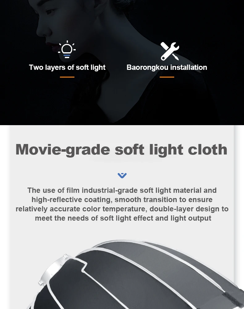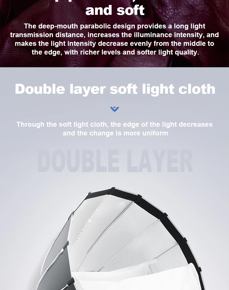 Шестигранный параболический софтбокс поддерживает хорошую отражающую производительность в относительно закрытой среде софтбокса, помогая диффузный резкий флэш-светильник, удаляя тени и обеспечивая максимальную мягкость даже светильник ing. Отлично подходит для любителей фотографии, новичков, полупрофессиональных и профессиональных фотографов и подходит для использования в свадебной, коммерческой рекламе, моде, живом шоу, студийной портретной видеосъемке и т. д.