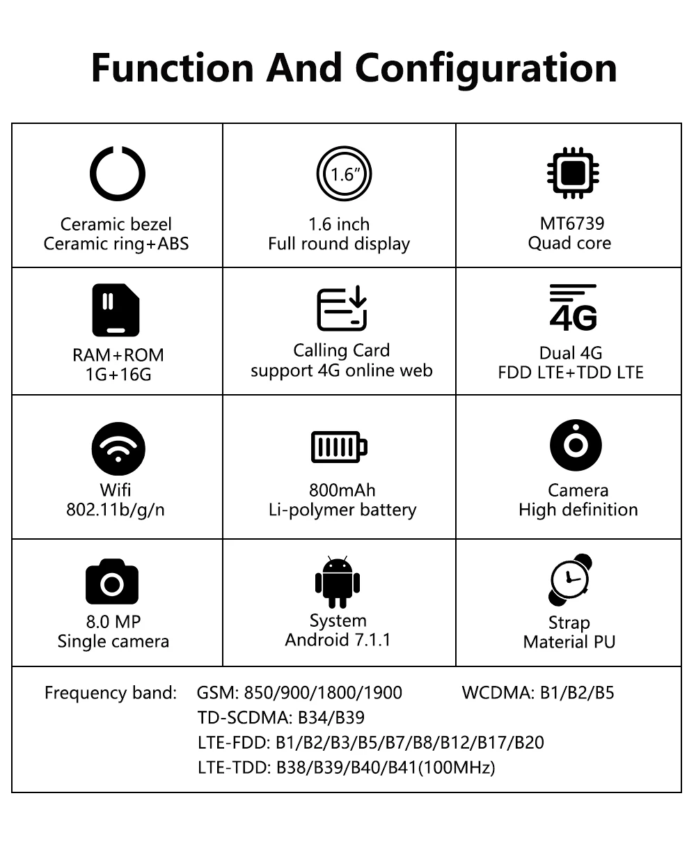 Характеристики: * ОС: Android 7,1, Процессор: четырехъядерный MT6739 * Частотный диапазон: 4G LTE-FDD:B1 + B2 + B3 + B5 + B7 + B12 + B20, LTE-TDD:B38 + B39 + B40 + B41(100 МГц) 3G WCDMA :B1 + B2 + B5 2G GSM:B2 + B3 + B5 + B8 * ОЗУ 1 Гб + ПЗУ 16 Гб * Поддержка Bluetooth 4,0/GPS-навигации/Wi-Fi * Пульсометр, шагомер, мульти спортивный режим * Аккумулятор большой емкости 800 мАч * Встроенная камера 8 МП * Перемещение дисплея светильник щения * Полный Круглый сенсорный экран 1,6 дюйма 400*400 dpi. * Сменный ремешок * Стильный Популярный Интерфейс часов на выбор * Поддержка iOS 11,1 версии выше и Android 6,0 версии выше * Поддерживаемые языки: китайский упрощенный, китайский традиционный, английский, французский, немецкий, испанский, португальский, итальянский, русский, польский, турецкий, корейский, иврит, индонезийский, вьетнамский, арабский, персидский, тайский, хинди, Бирманский, бенгальский, японский Упаковочный лист 1 * Розничная коробка 1 * умные часы 1 * кабель для зарядки 1 * Руководство пользователя
