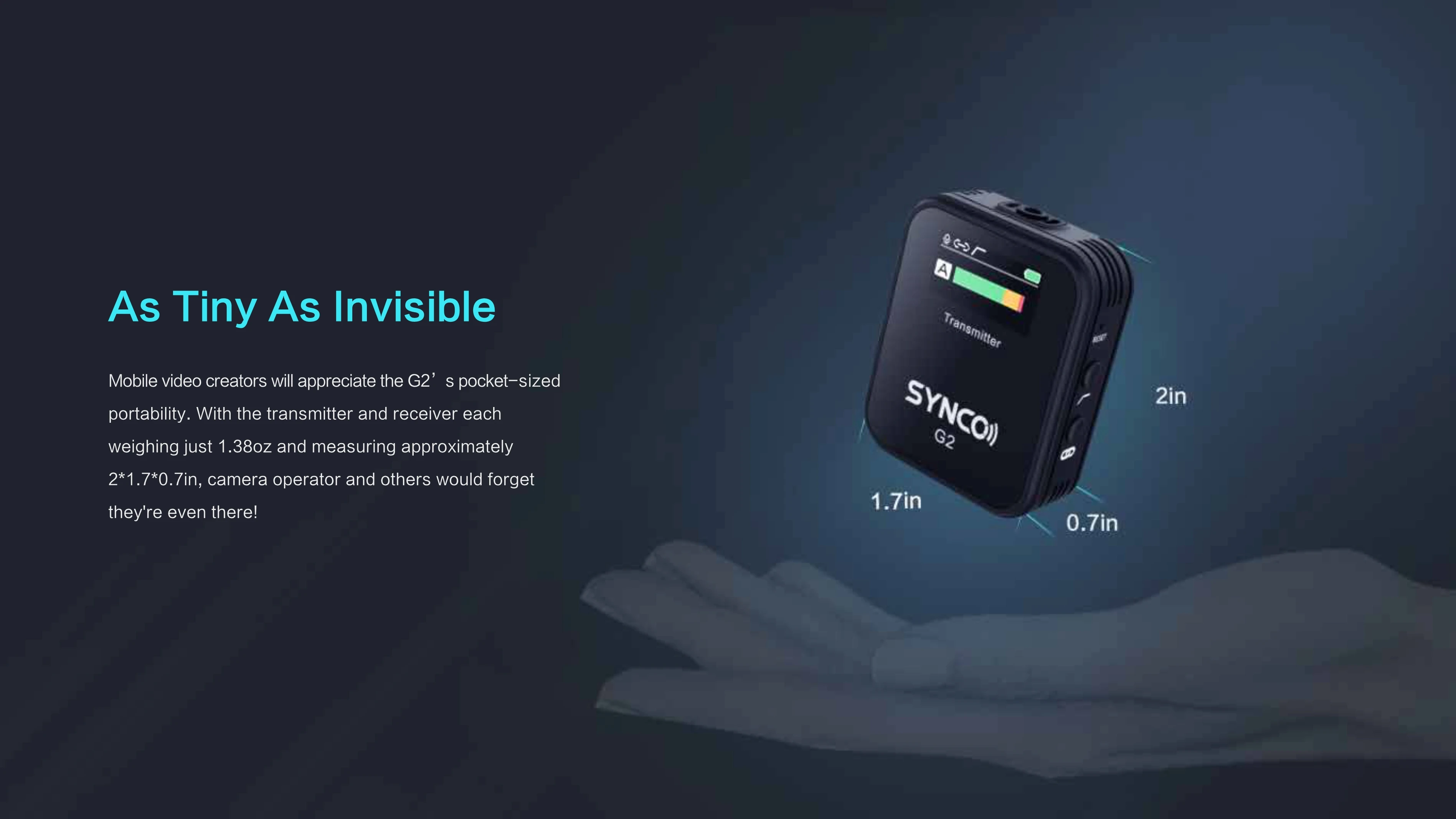 SYNCO G2(A2)-лучшая бюджетная Беспроводная петличная микрофонная система серии G 2-го поколения, которая, подобно SYNCO G1, также поставляется в 2 формах, 1-to-1 G2(A1) И 1-to-2 G2(A2). Новый беспроводной микрофон Поставляется от G1(A2) и возрождается с дисплеем для отображения всех основных показателей. Он продолжает обработку входного аудио по запатентованной технологии и отправку чистого, четкого звука на основе технологии цифровой передачи 2,4 ГГц. С 1 приемником и 2 передатчиками, G2(A2) является двухканальной беспроводной микрофонной системой для записи двух источников звука одновременно, в частности, И является лучшим бюджетным микрофоном для широкого спектра приложений для создания контента.