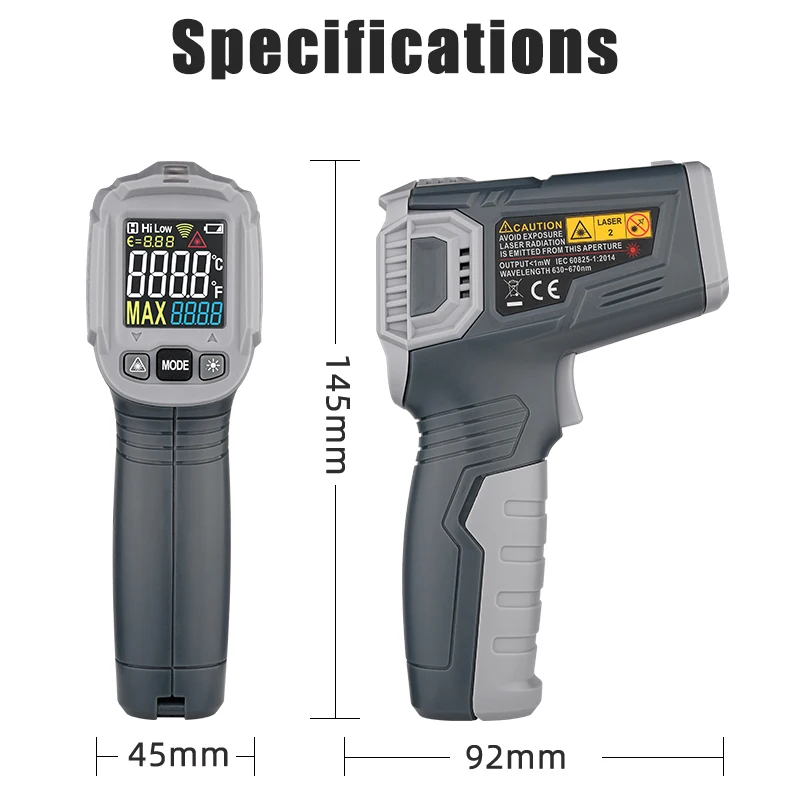 Характеристики: Модель: HT650A Цвет: серый Материал: АБС-пластик Диапазон измерения температуры:-50 ℃ ~ 380 ℃(-58 ℉ ~ 716 ℃) Точность:-50 ℃ ~ 0 ℃(-58 ℉ ~ 32 °F):± 3 ℃ Излучение: 0,1 ~ 1,00 D:S:12:1 Лазерная указка:<1 мВт/630-670нм Уровень 2 Спектральная Характеристика: 8 ~ 14 мкм ℃/℉: Да Дисплей: цветной ЖК-дисплей Время отклика: <0,5 сек Предельная сигнализация температуры: Да Хранение данных: Да Автоматическое выключение: Да (30 сек) Макс: Да Индикация низкого заряда батареи: Да Питание: 2x1,5 V AAA Батарея (Батарея не прилагаются во время упаковки) Вес: около 100 г Размер: 145x92x45 мм Примечание: ● Не поставляется с батареями ● Внимательно прочитайте руководство пользователя перед использованием Упаковочный лист: ● 1 Инфракрасный термометр ● 1 тканевый мешок ● Руководство пользователя (на английском языке)-1 шт.