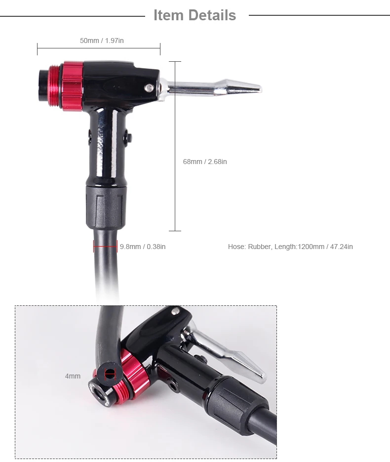 · GCT-01: Переходник из сплава с ЧПУ, шланг 120 см, с отбеливателем, просто замените красный клапан на Schrader и Presta.