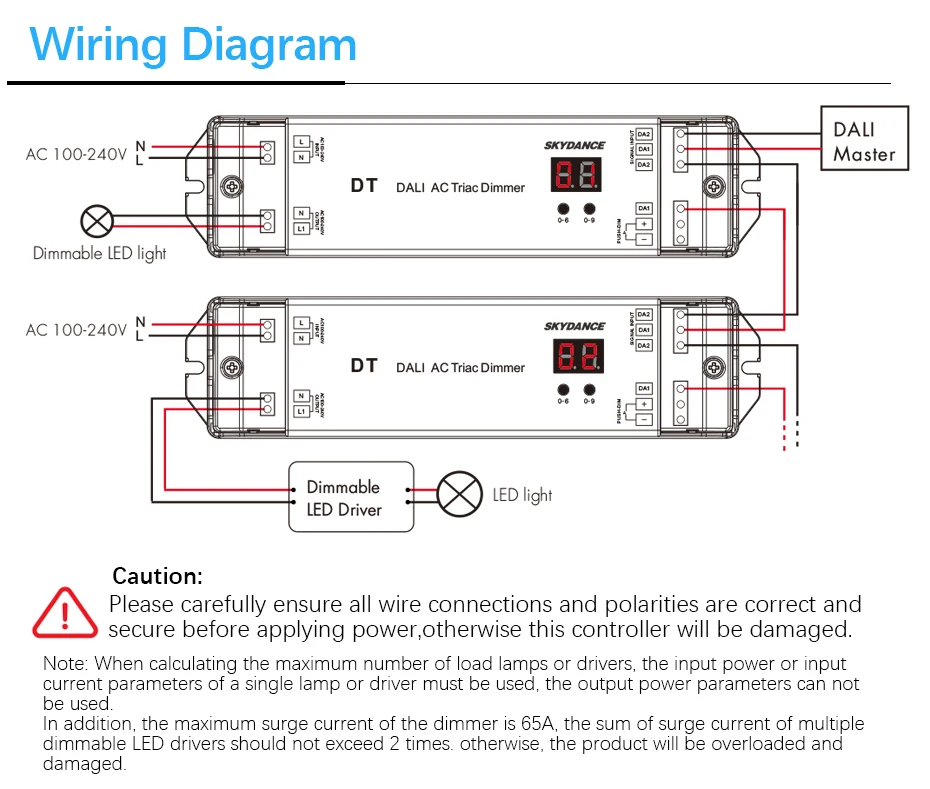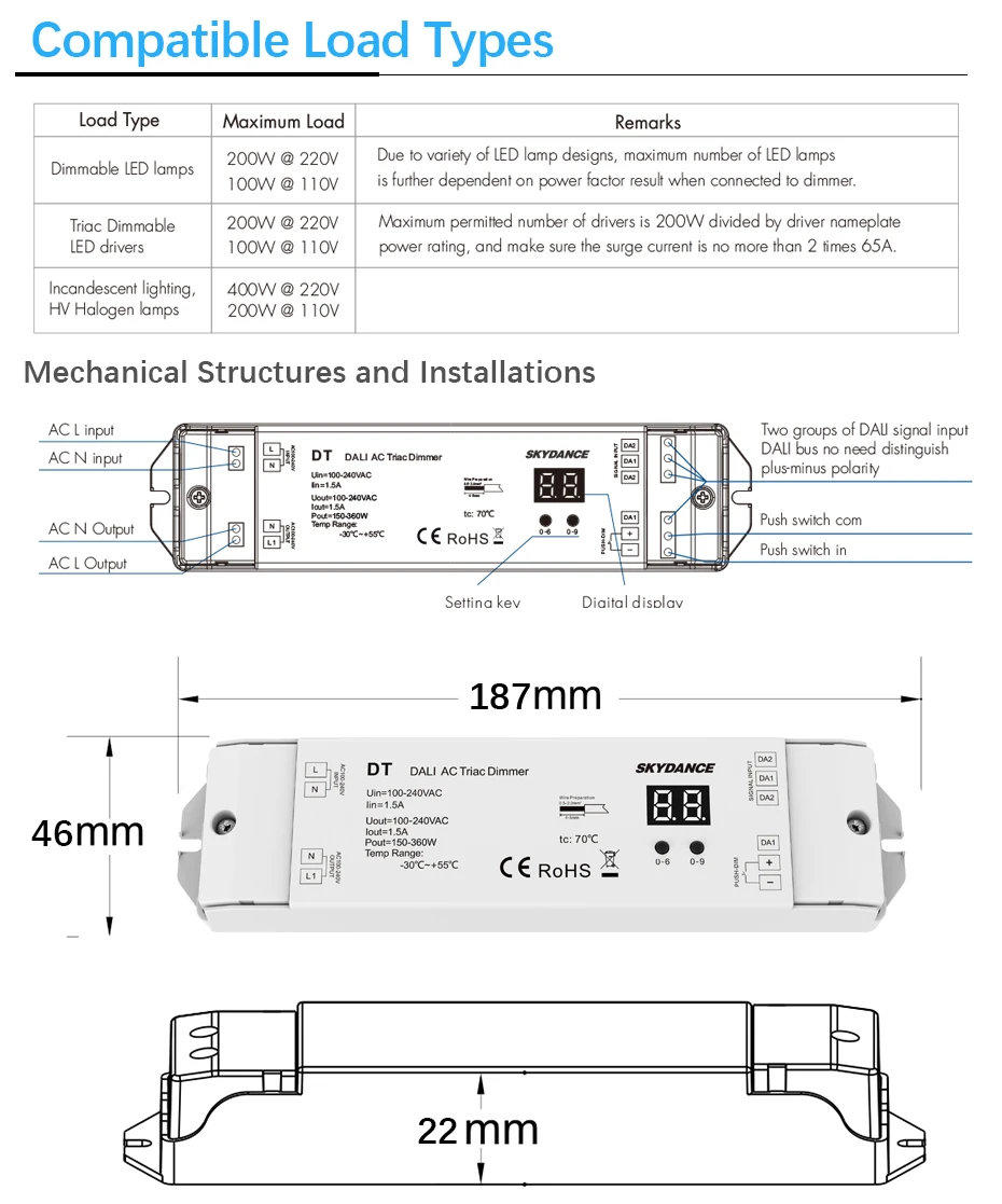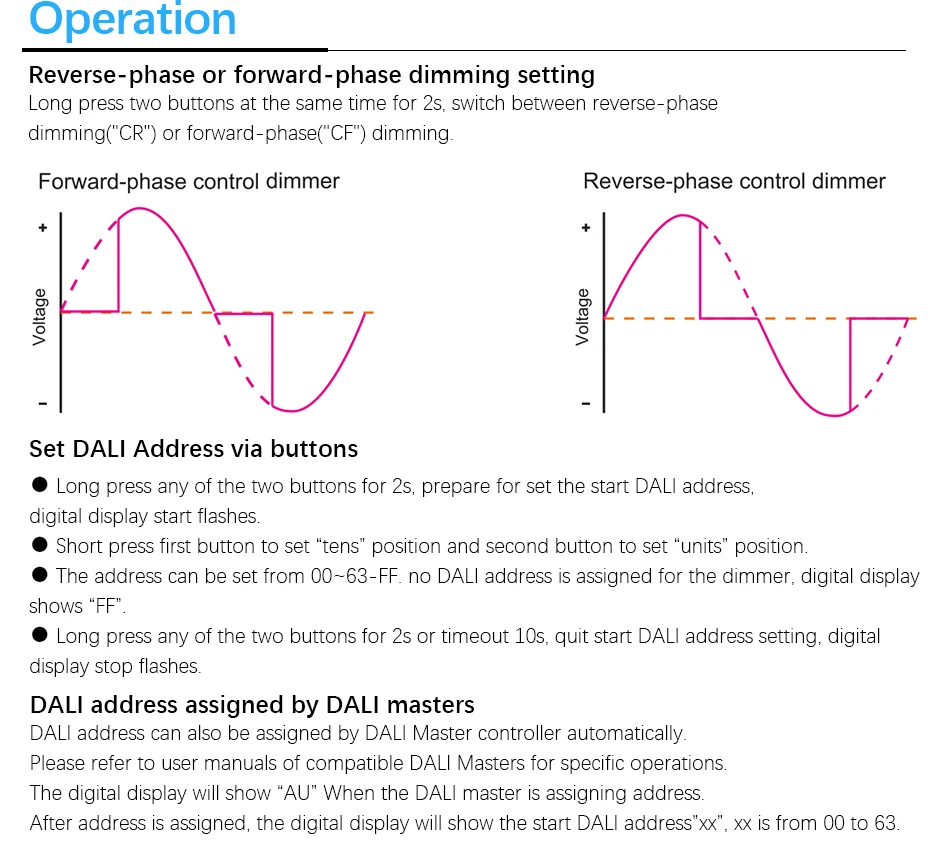● Переменный фазовый mosfet DALI dimmer, один DALI адрес, один канал выхода.● В соответствии со стандартом DALI IEC 62386-102, IEC 62386-207 и в соответствии с продукцией DALI от других международных организаций.● Адрес DALI можно присваивать вручную и отображать на цифровом дисплее или автоматически присваивать DALI master.● Переключение на обратную фазу или переключение на переднюю фазу.● Подключение к внешнему кнопочному переключателю для обеспечения включения/выключения и 0-100% функции затемнения.● Затемнять и включать одноцветные затемнения светодиодный лампы, традиционные лампы накаливания и галогенные лампы.● Защита от перегрева, восстановление автоматически