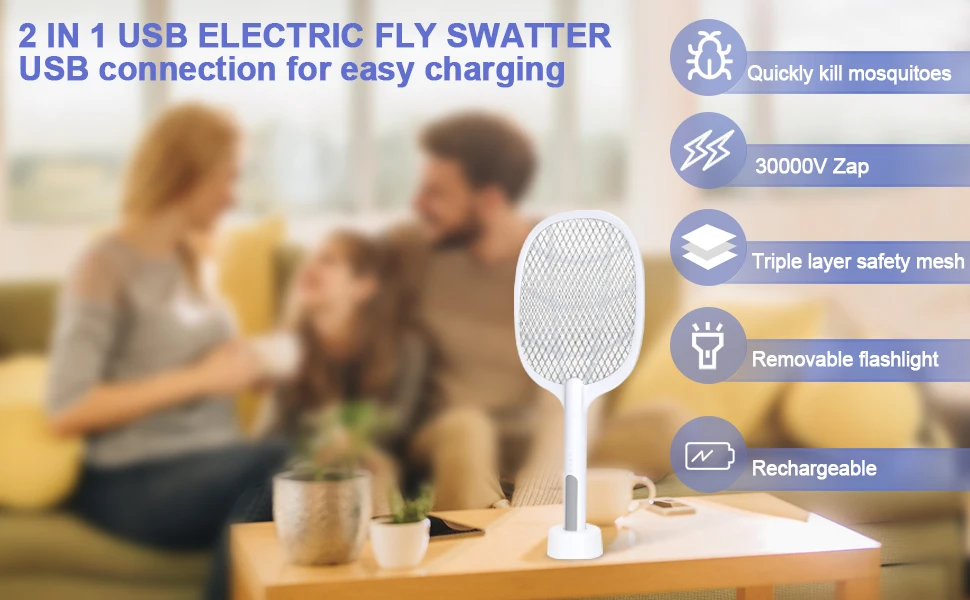 3, быстрая зарядка через USB-Москитная zapper Встроенная перезаряжаемая литиевая батарея емкостью 1200 мА · ч. Вы можете подключиться к любому usb-устройству для быстрой и эффективной зарядки этой ракетки fly zapper.
