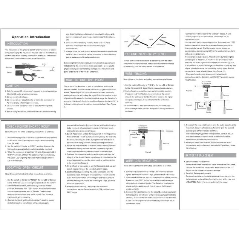* Простота в использовании: Просто подключите передатчик в серии с цепи или провода под тестом, (i. Е.: в месте выдувного предохранителя, через соединитель, в серии с открытым проводом, светильник с гнездом лампы и т. д.), И сканирование цепи/провода с помощью гибкого зонда для отслеживания неисправности