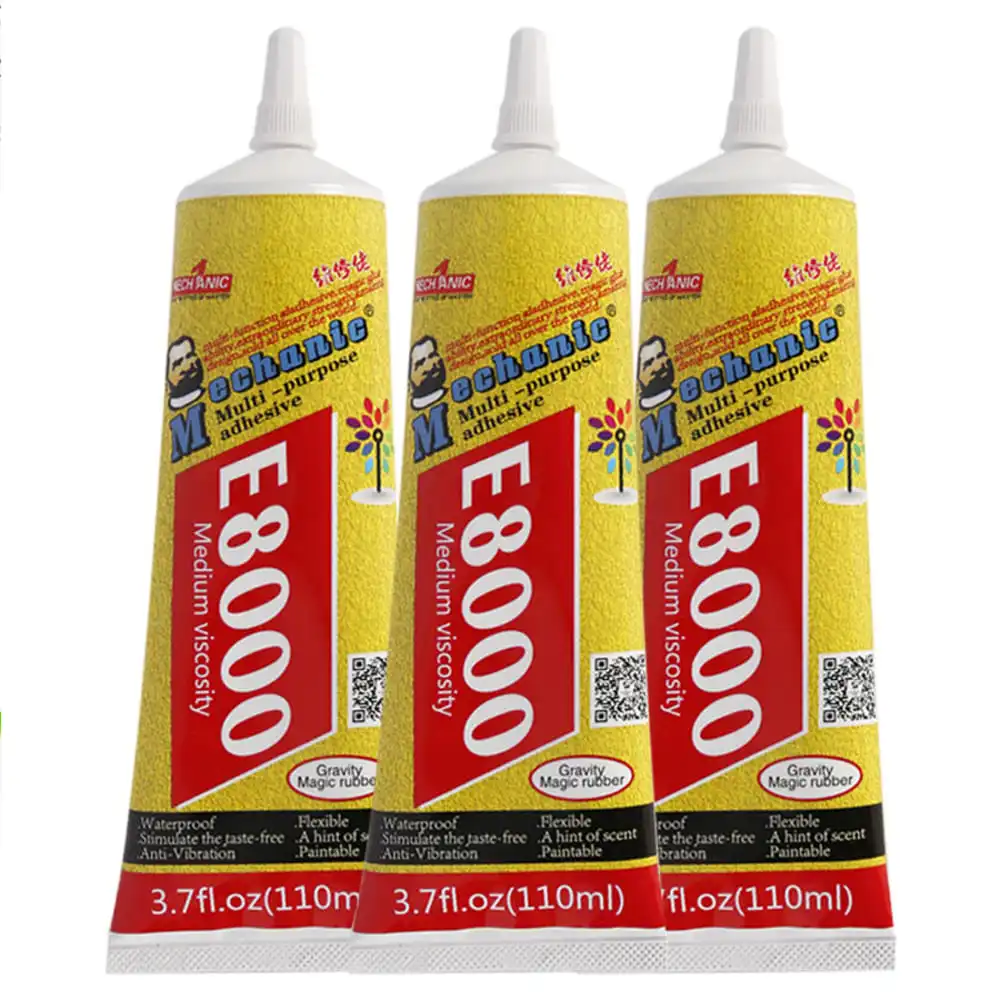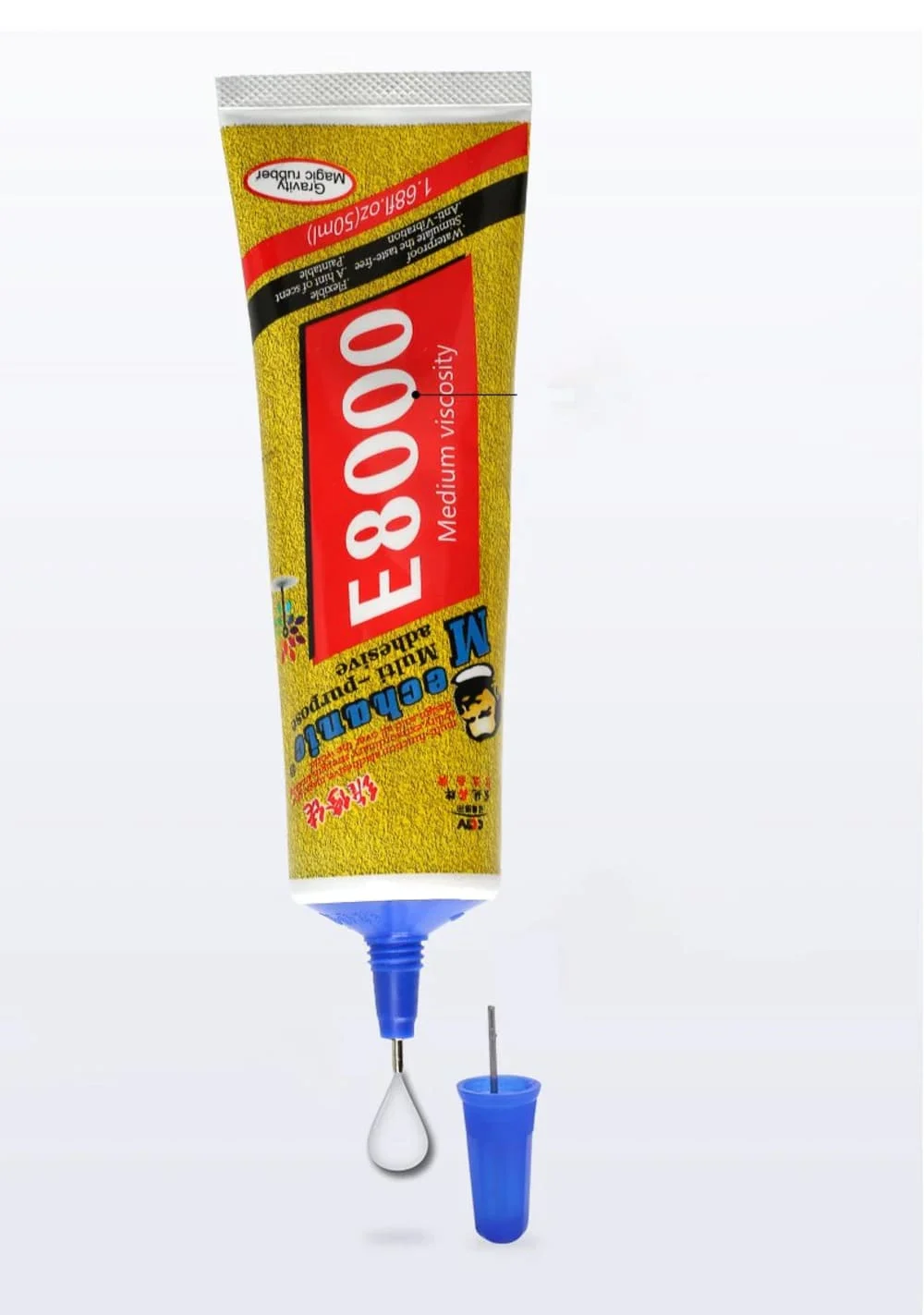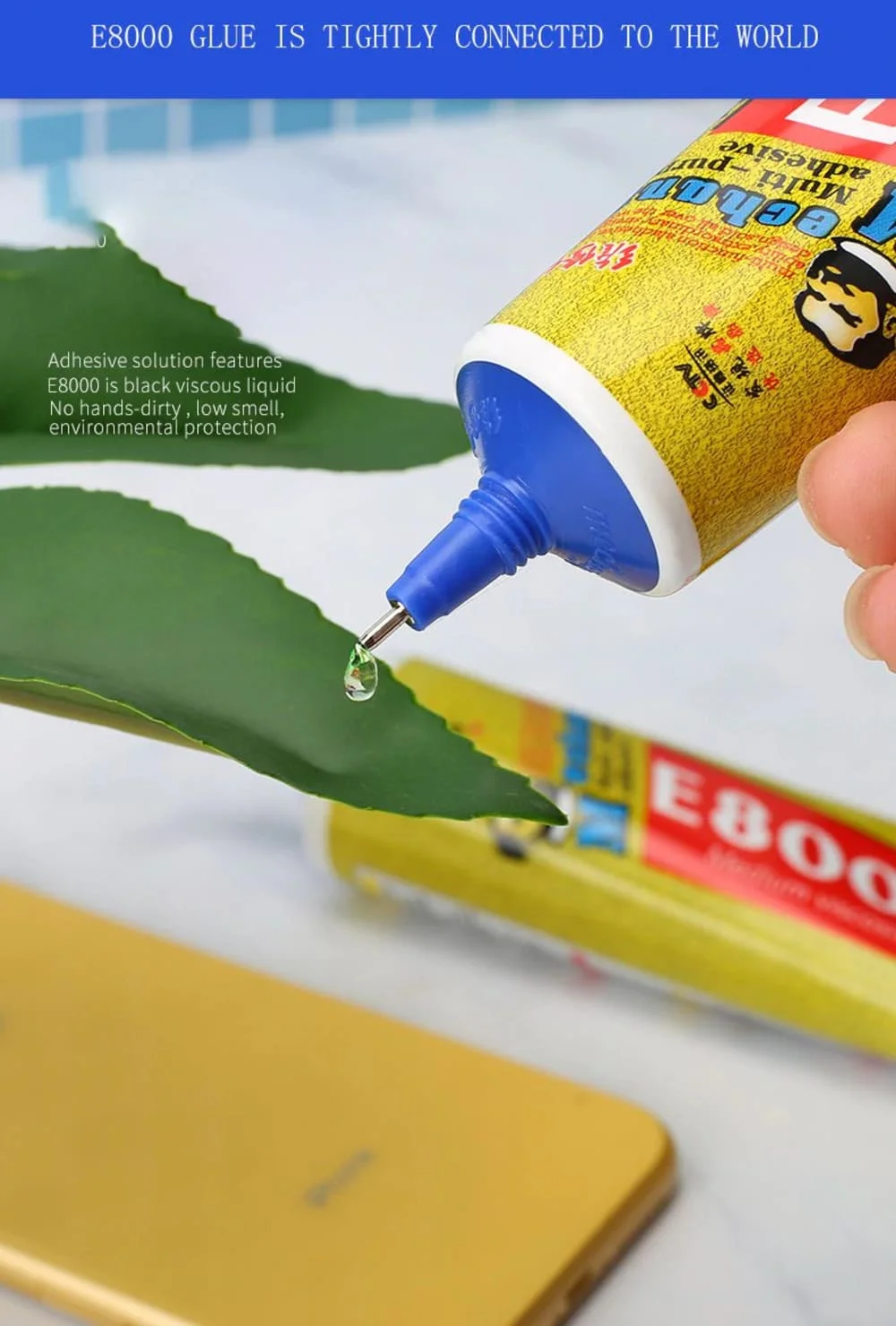 Универсальная клеящая жидкость E-8000 используется в различных сферах, склеивает бижутерию, стекло, стразы, дерево, металл, стекловолокно, керамику, кирпич, бетон, кожу, резину, винил и т.д.
