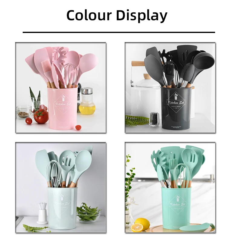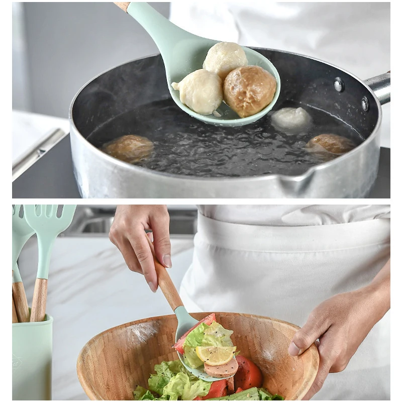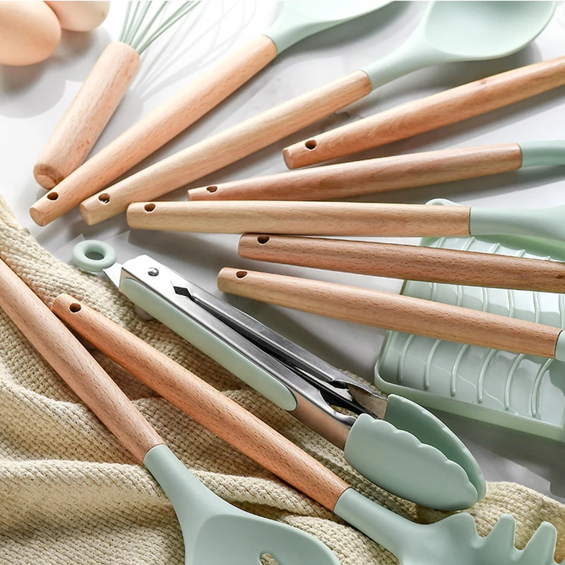Набор силиконовых кухонных принадлежностей из 12 предметов, антипригарные лопатки лопата с деревянной ручкой, набор кухонных инструментов с деревянным ящиком для хранения, кухонные инструменты