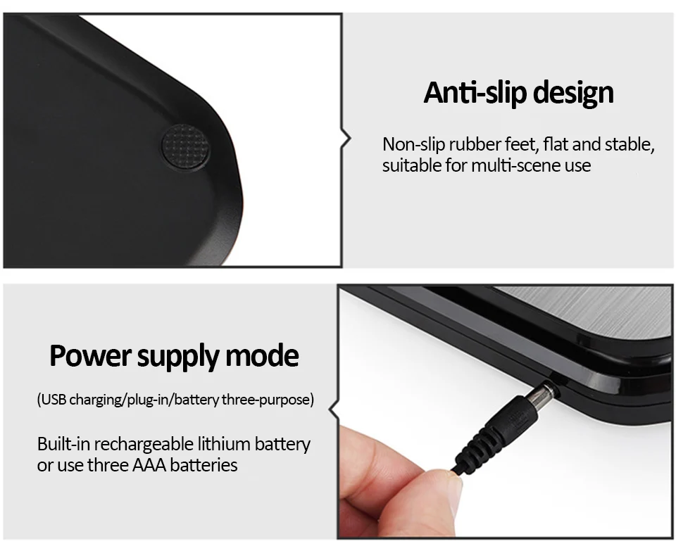 1. Четкий читаемый дисплей, большой ЖК-цифровой дисплей, дисплей данных четкий и точный. 2. Встроенный литиевый аккумулятор, питание от USB или 3 батареи xAAA (не входят в комплект) источник питания, несколько методов питания более удобны. 3. Изготовлен из высококачественного АБС-пластика и нержавеющей стали, который трудно выцветать или деформации. 4. С помощью высокоточного датчика взвешивания, точного взвешивания, скорость ошибки чрезвычайно мала. 5. Вся машина является водонепроницаемой, простые кнопки, Нескользящие подушечки для ног, одна шкала для нескольких целей.