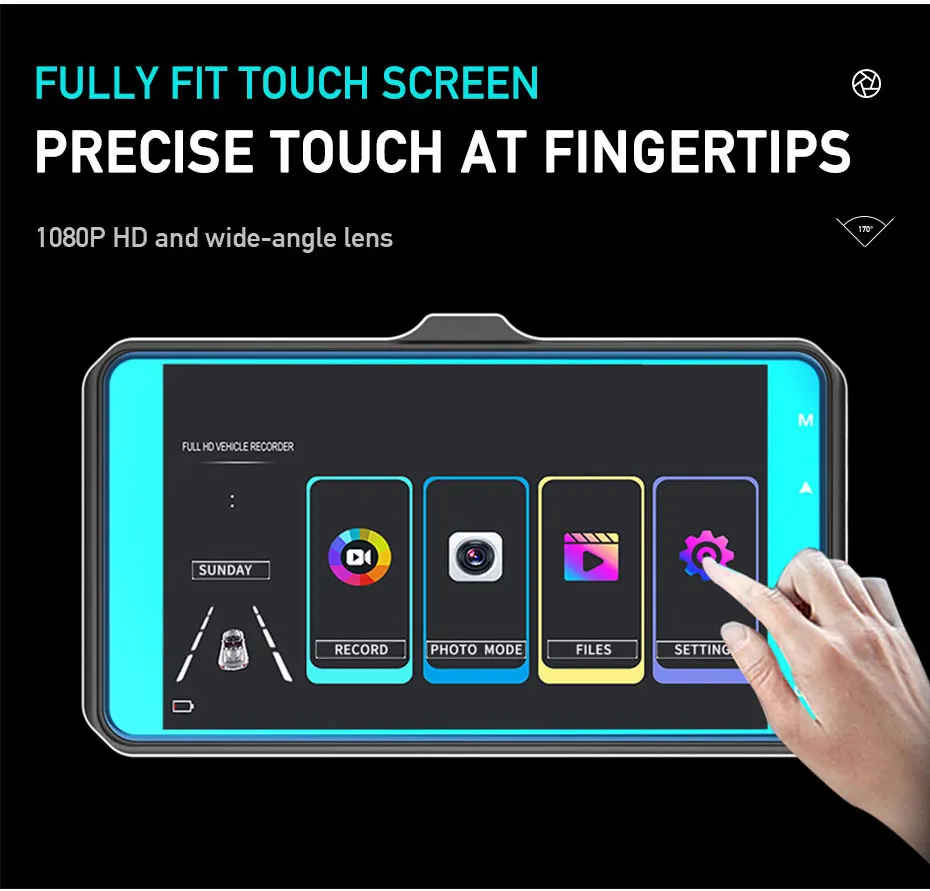 G-Sensor, Motion Detection, Parking Monitor, Time&Data Display, Wide Dynamic Range, ON/OFF Automatically, Reverse Image,Night Vision, Touch Screen, Loop Record