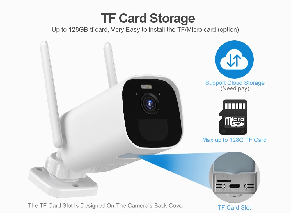 Вы также можете использовать карту microSD max 128G для хранения и воспроизведения видео, записанных этой наружной камерой безопасности.