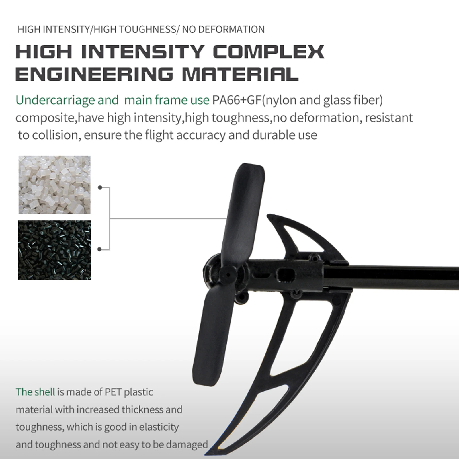 * Сложный инженерный материал высокой интенсивности: ходовая часть и основная рама используют композитный материал PA66 + GF (нейлон и стекловолокно), обладают высокой интенсивностью, высокой вязкостью, без деформации, сопротивления. При столкновении обеспечивается точность полета и долговечность использования.