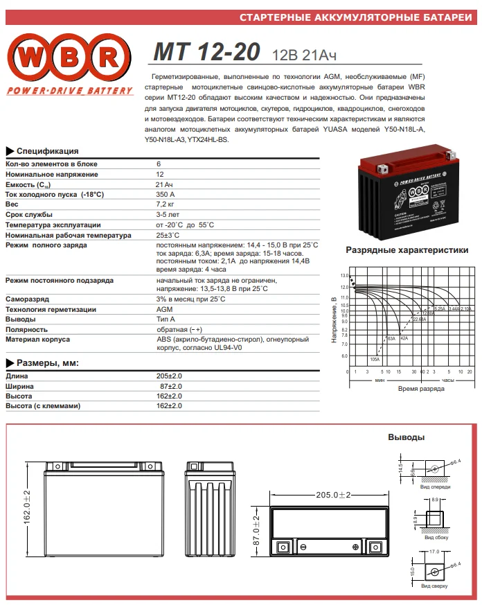 Герметизированные, выполненные по технологии AGM,необслуживаемые (MF) стартерные мотоциклетные свинцово-кислотные аккумуляторныебатареи WBR серии МТ12-20 обладают высоким качеством и надежностью.
