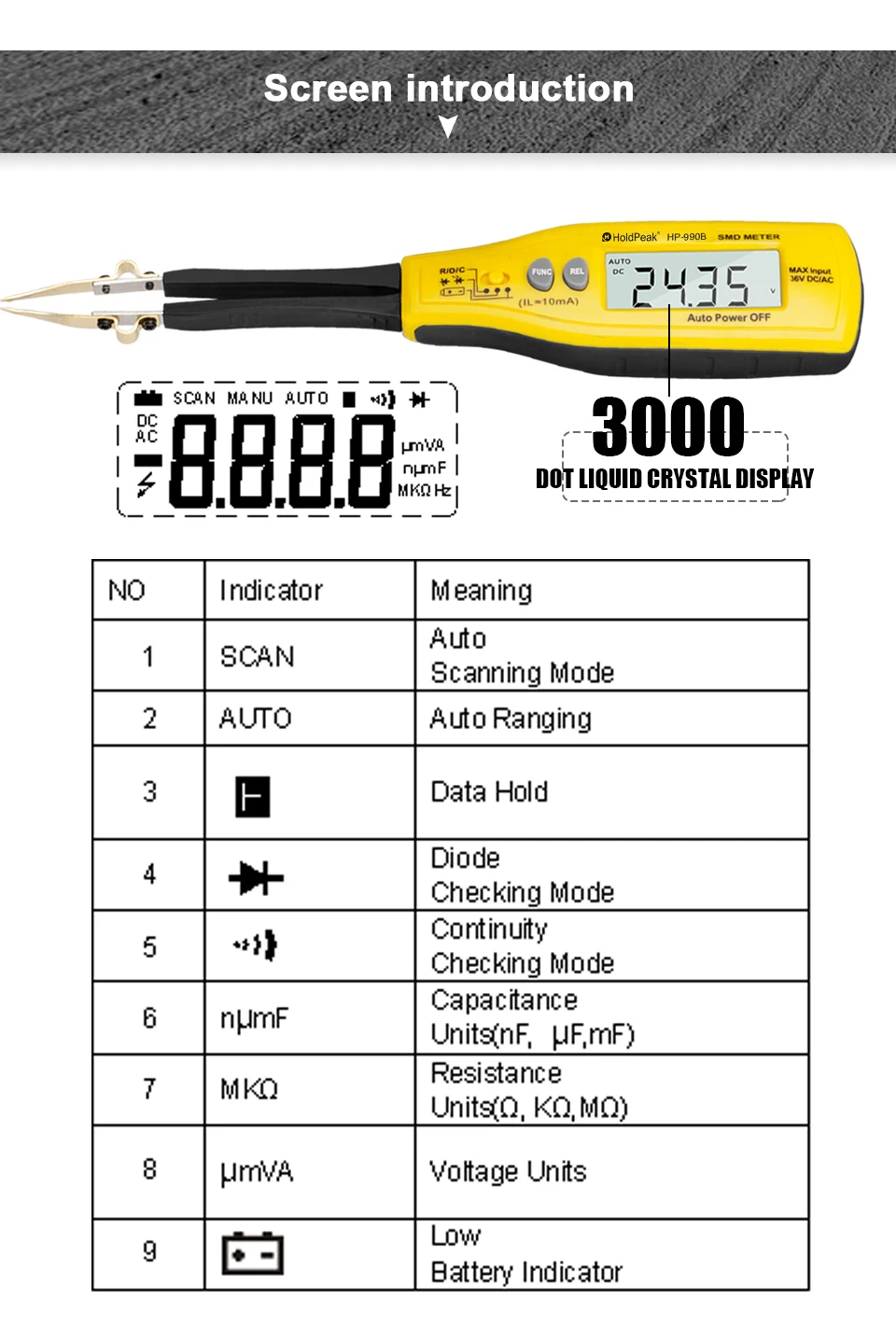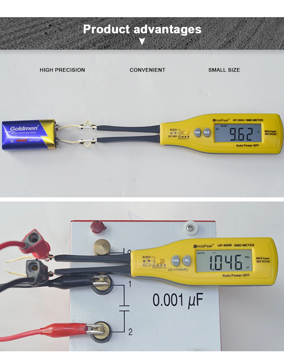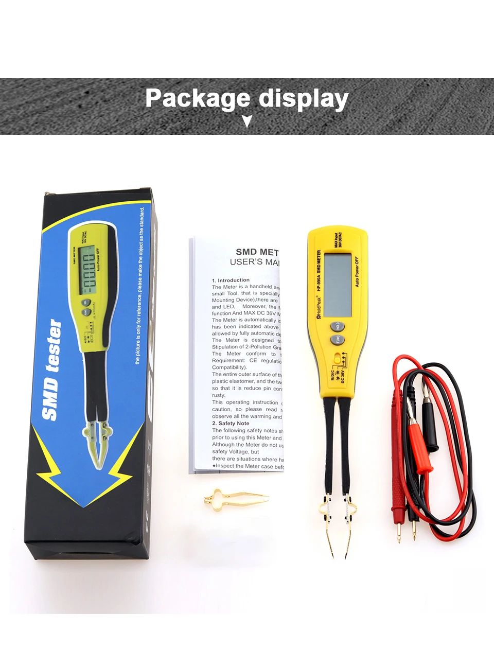 HP-990C-это ручной и работающий от аккумулятора очень удобный небольшой инструмент, который специально используется для измерения SMD (поверхностного монтажа устройства), есть резистор, конденсатор, диод, зенерсветодиодный.
