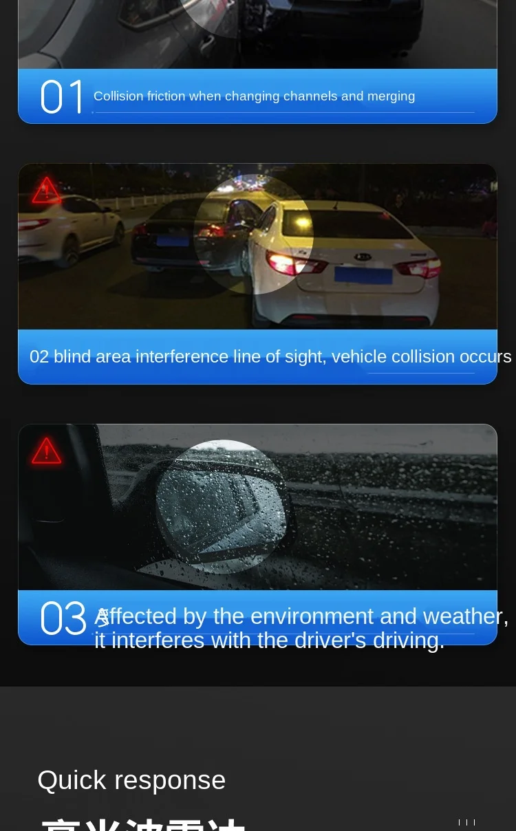 4. Предупреждение об открытии двери. Когда вы открываете дверь, за вами будут обнаружены транспортные средства, пешеходы и мотоциклы, и будет дано точное предупреждение. 5. Дожидаясь светофора: после остановки транспортное средство находится за неподвижным объектом, и зона слепых зон не будет сигнализировать. 6. При нормальном вождении: когда скорость автомобиля идет сзади медленнее, чем у нас, нет опасности столкновения, и сигнализация не выдается;