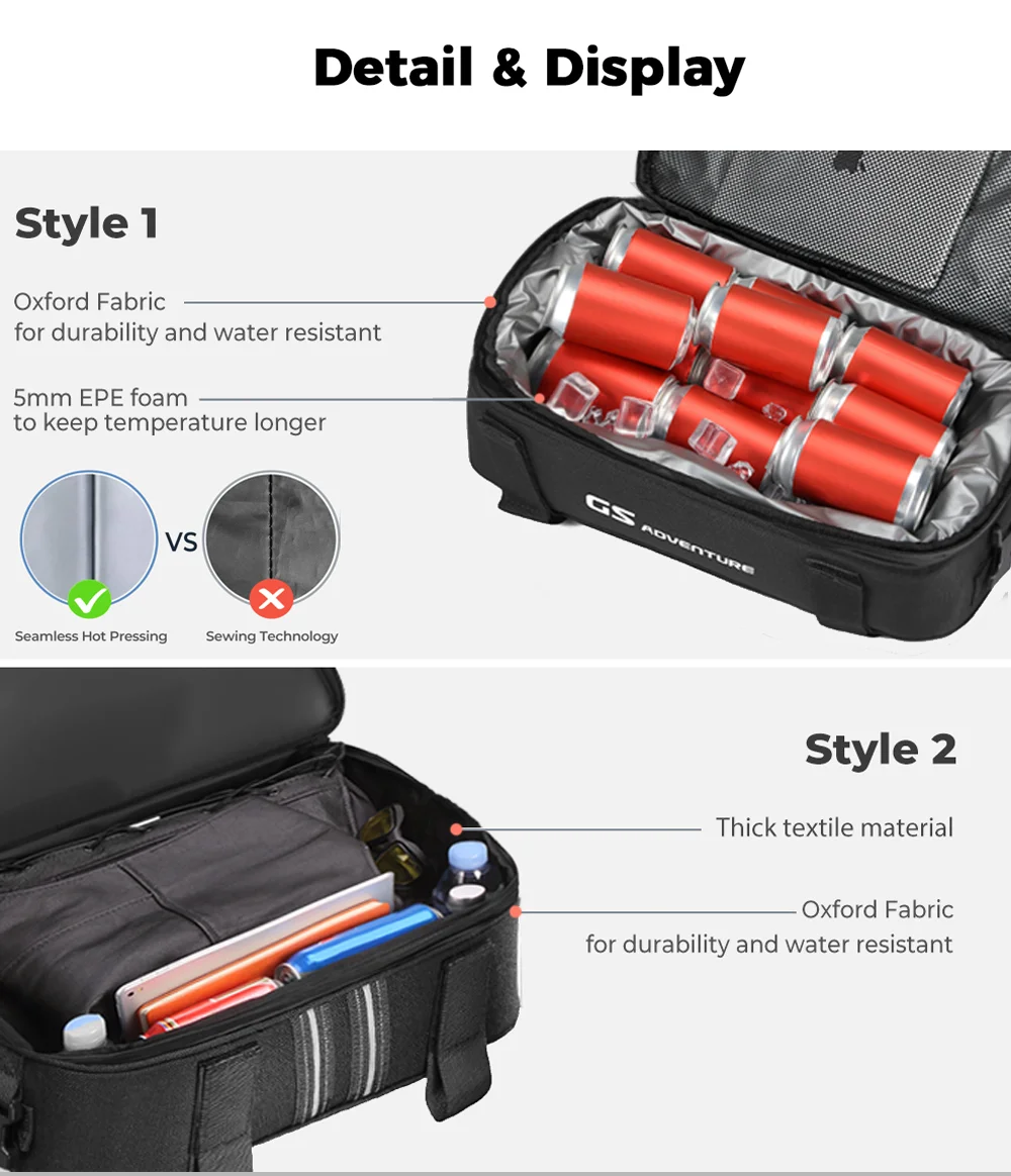 Стиль 2 материал сумки: Жесткий 1680D ПВХ водостойкий толстый текстильный материал, прочный, водостойкий и изолированный.
