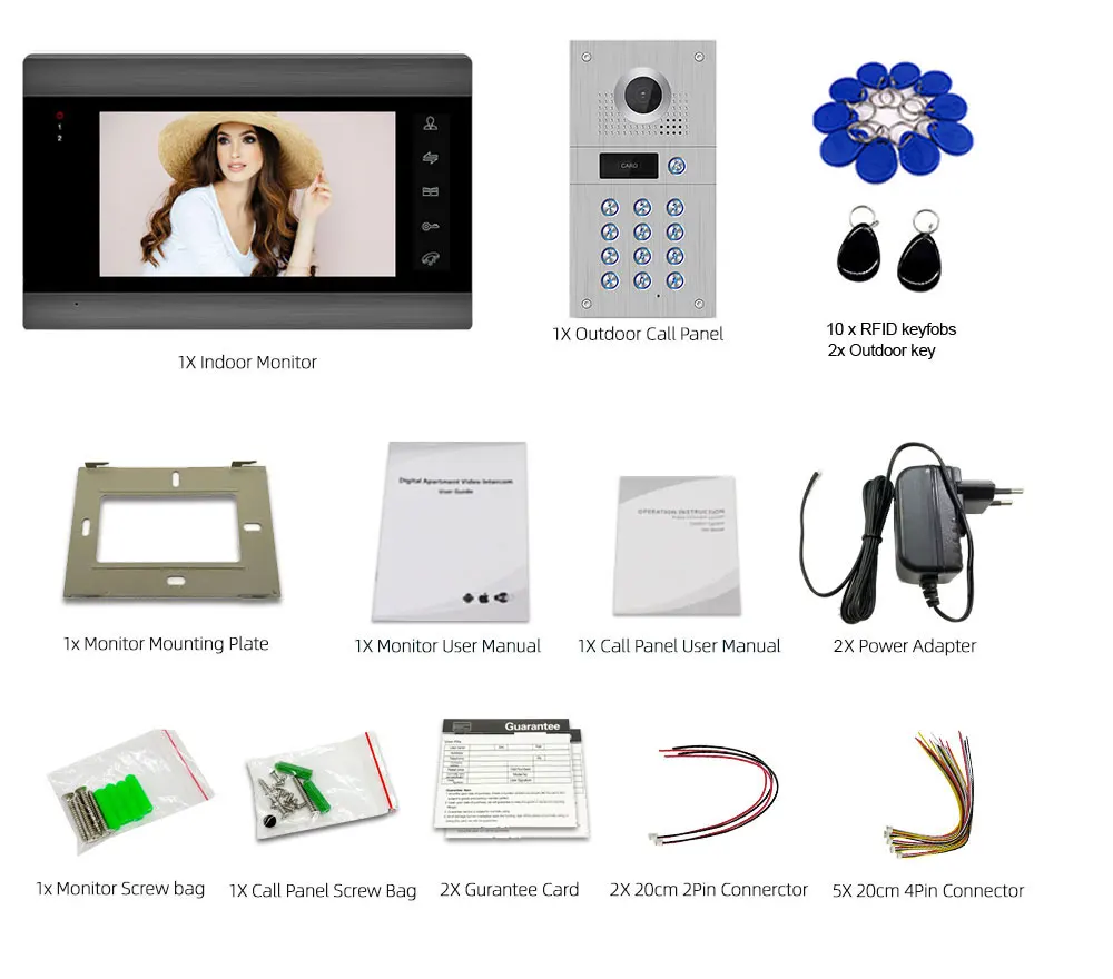 Поддержка монитора для подключения 6 внутренних мониторов, 2 замков, 2 панели вызова и 2 камеры наблюдения в основном, этот товар является бесплатным и доступен для двусторонней связи. Он поддерживает связь между внутренним монитором и наружной камерой, но также поддерживает связь между монитором и монитором. Вы не всегда будете спускаться вниз, открыв дверь после установки многократного домофона, даже если никто не прижмет дверной звонок, вы все равно можете смотреть изображения, сделанные дверным звонком в мониторе