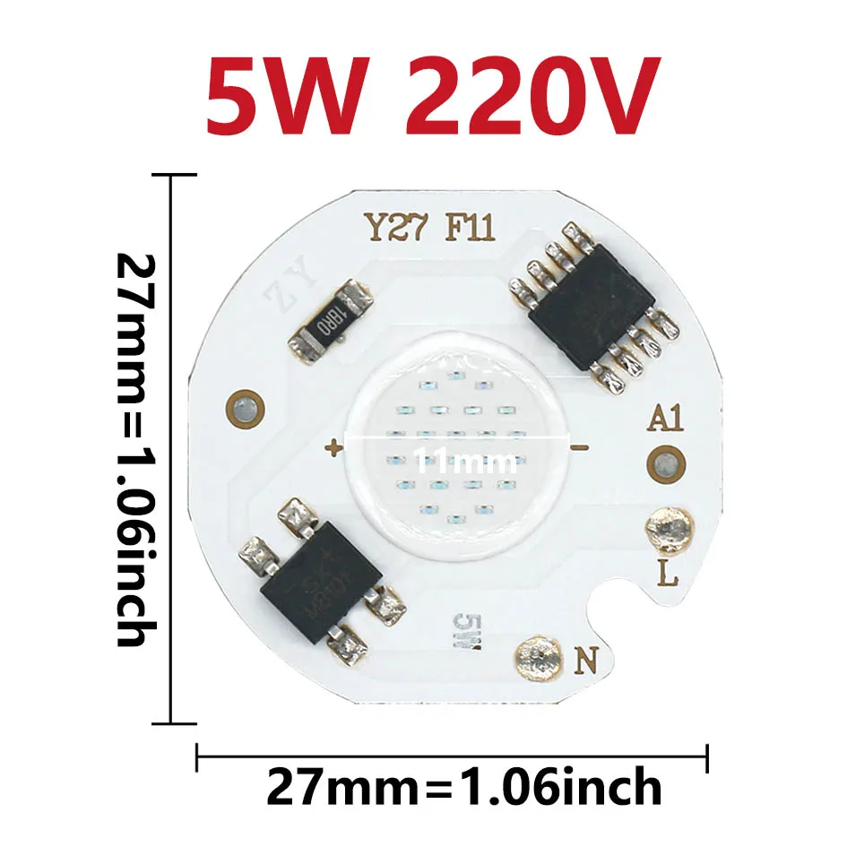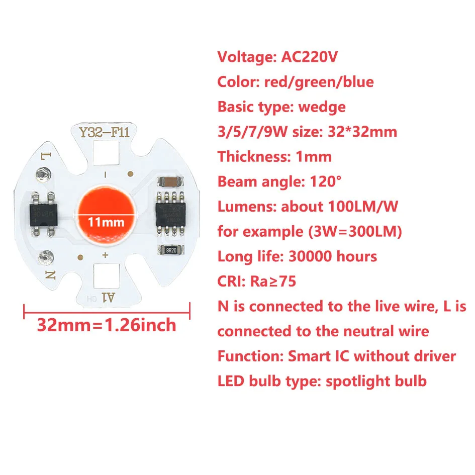 Мощность: 3 Вт/5 Вт/7 Вт/9 Вт Напряжение: ac220в Цвет: красный/зеленый/синий Основной тип: танкетка 3/5/7/9W Размеры: 27*27mm/32*32 мм Толщина: 1 мм Угол луча: 120 ° Люмен: около 100 лм/Вт, например (3 Вт = 300 лм) Длительный срок службы: 30000 часов CRI: Ra≥ 75 N подключен к живому проводу, L подключен к нейтральному проводу Функция: Smart IC без драйвера Светодиодный Тип лампы: прожектор Область применения: квадраты, сады, парки, корты, наружные, используются в прожекторах. Ремонт и модификация DIY. Напоминание: чип не подходит для прямого тестирования, ему нужен радиатор, а рабочая температура не может превышать 60 °C, что легко сжечь. Он должен быть установлен и исправлен перед тестированием, спасибо.