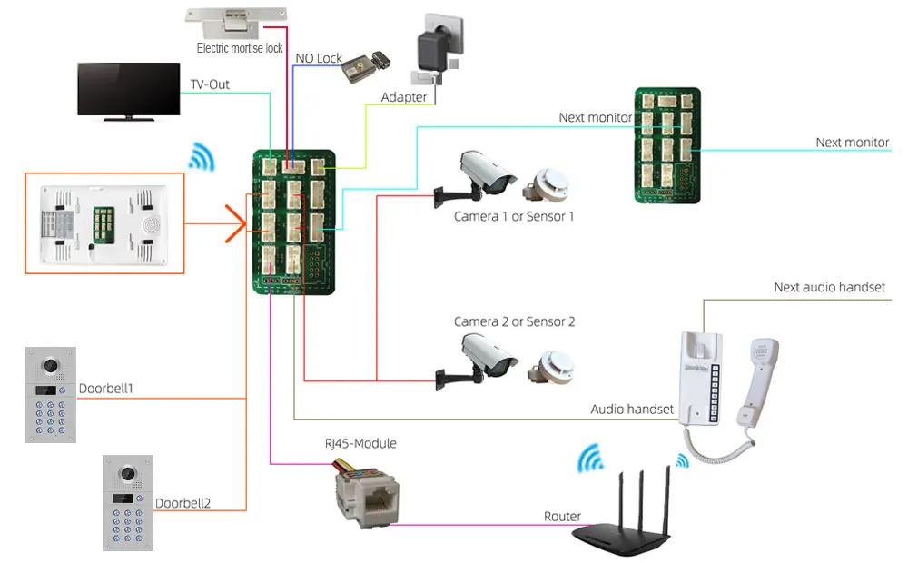 Поддержка монитора для подключения 6 внутренних мониторов, 2 замков, 2 панели вызова и 2 камеры наблюдения в основном, этот товар является бесплатным и доступен для двусторонней связи. Он поддерживает связь между внутренним монитором и наружной камерой, но также поддерживает связь между монитором и монитором. Вы не всегда спустились вниз, откройте дверь после установки нескольких домофонов