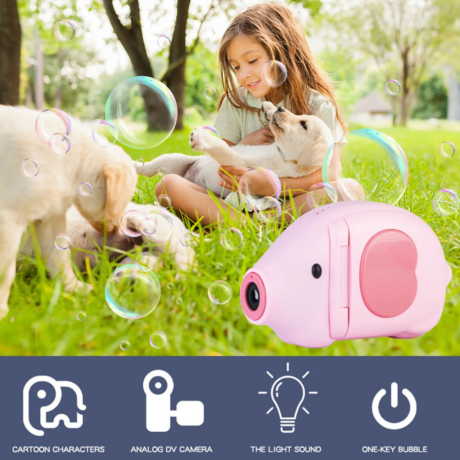 Характеристики: Название: машина для пузырьков слона Материал: пластик Параметры: около 18 см * 19,5 см * 8 см/7,09*7,68 * 3.15in Функция: светильник, музыка, автоматический Способ упаковки: цветная коробка Цвет: розовый DV bubble camera, небесно-голубой DV bubble camera Обучение способностям: интерактивные игрушки для родителей и детей, обучение