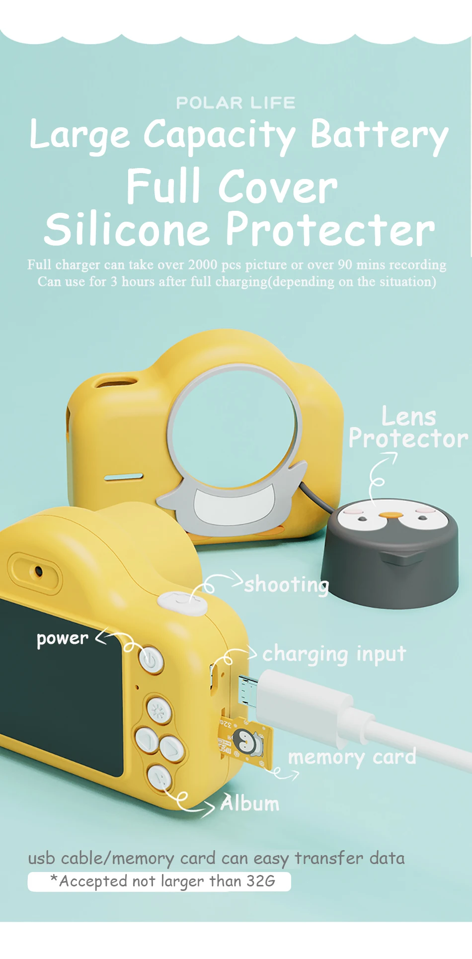 Детская камера не имеет памяти. Вам нужно вставить карту памяти для фотографирования. Максимальная поддержка 32G.
