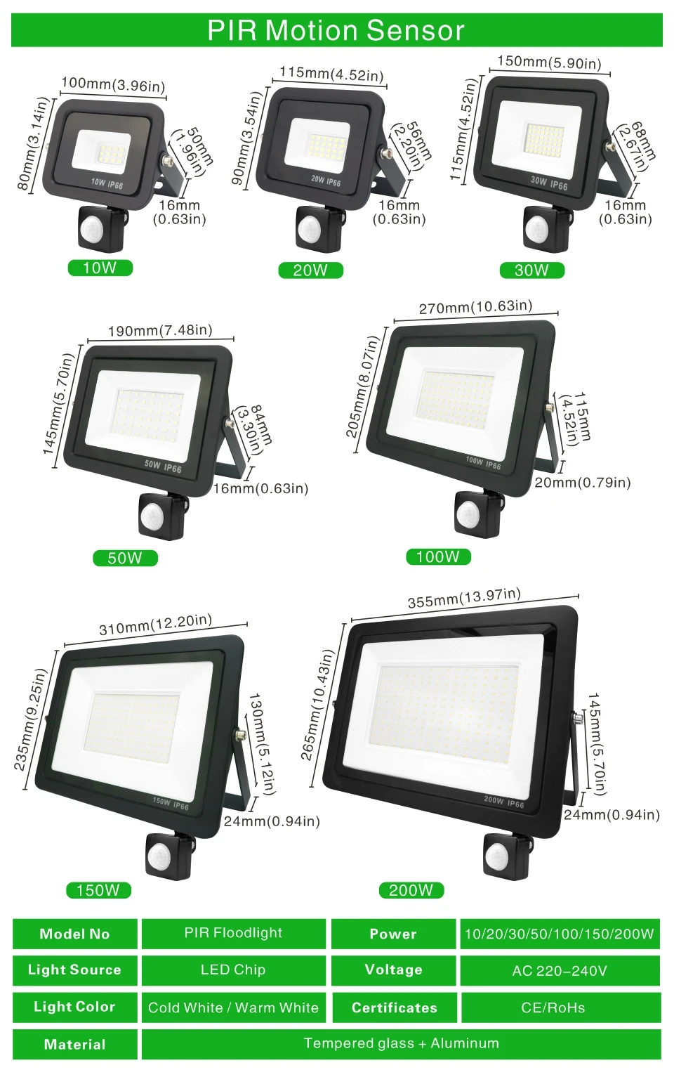 Светодиодный PIR датчик движения прожектор светильник 10 Вт 20 Вт 30 Вт 50 Вт 100 Вт 150 Вт 200 Вт наружный светильник ing прожектор светильник IP66 водонепроницаемый светодиодный светильник