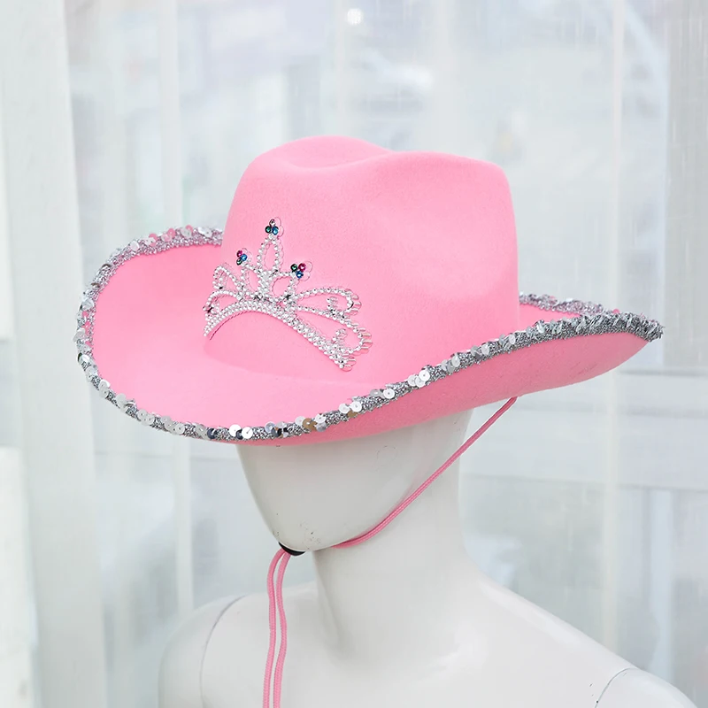 Розовая ковбойская шляпа в западном стиле, женские модные вечерние фетровые кепки с широкими краями, украшенные блестками, корона, тиара, ковбойская девочка